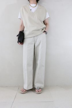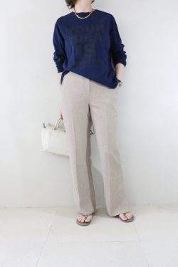 淡いベージュの半袖スウェットは、やわらかな色味とコンパクトすぎない程よいゆとりで、気負わず取り入れやすい一枚。スウェット素材ながらもラフになりすぎず、落ち着いた印象にまとまります。ネックまわりのすっきりしたデザインも、さりげなく上品さを添え