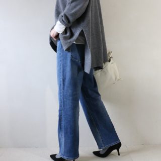 パンツはチャコールグレーに近いカラーのスタイリングを選びました。テーパードシルエットのコーデュロイパンツは GALERIE VIE のお品です。細コーデュロイなので野暮ったくならずすっきり履いていただけます。ボリュームのコートを羽織る場合は細身パンツを選びがちになりますが、細すぎより適度な緩みがあるテーパードが今っぽく仕上げてくれます。