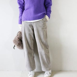 カラーは春に着たい淡色コーデでソフトな女性らしい配色にしました。淡いパープルのパンツは肌馴染みもよく着やすいトーンです。テーパードシルエットなのでニットともバランスよく相性◎。ウエストゴムもありきれいめでもリラックスできるデザインです。