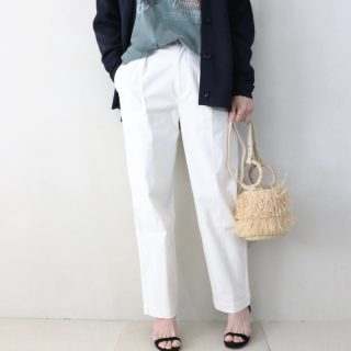 今回は遊び心があるカジュアルなTシャツと綺麗めなパンツで、ぐっと大人っぽくモダンな組み合わせにしました。配色は品よく白×ベージュにしました。ベージュのパンツはセオリーのお品でさらりとした上品素材。大き目のポケットが腰回りをカバーしてくれます。