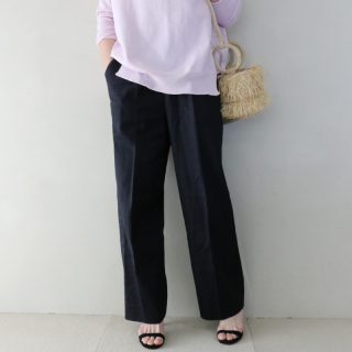 ボトムスはハリのあるベーシックパンツにさらっとコーデ。トップスはインしていますが、リボン調のベルトがアクセントのパンツで、出してもとても可愛いデザインです。