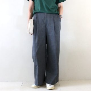 旬のトレーナーでミントグリーンのタックパンツを更新。ドロップショルダー+タック使いでひとクセある可愛いデザインが目をひくはずです。身幅がありつつパンツに相性がよい丈をセレクトしました。