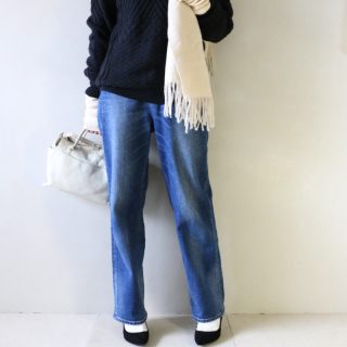 脇サイドのデザインが特徴的なとても可愛いオーバーニット。ふわふわとしたほっこり感がある素材です。モノトーンのベーシックカラーの組みわせでは好みの小物で差し色を入れるとまとまります。今回はイエローのストールでスパイスを効かせました。