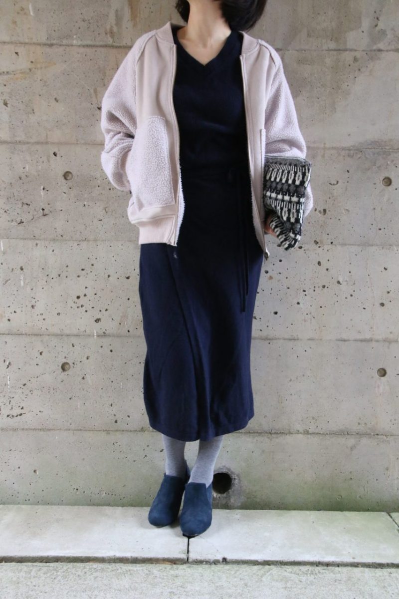 レディなニットワンピースにカジュアルブルゾンをONしてこなれた普段使いに仕上げました。ワンピースはスカート部分が巻きタイプになっていて、ウエストでリボン結びで止める間延びしないデザインになっています。おでかけワンピとして上品に使っても勿論OK。