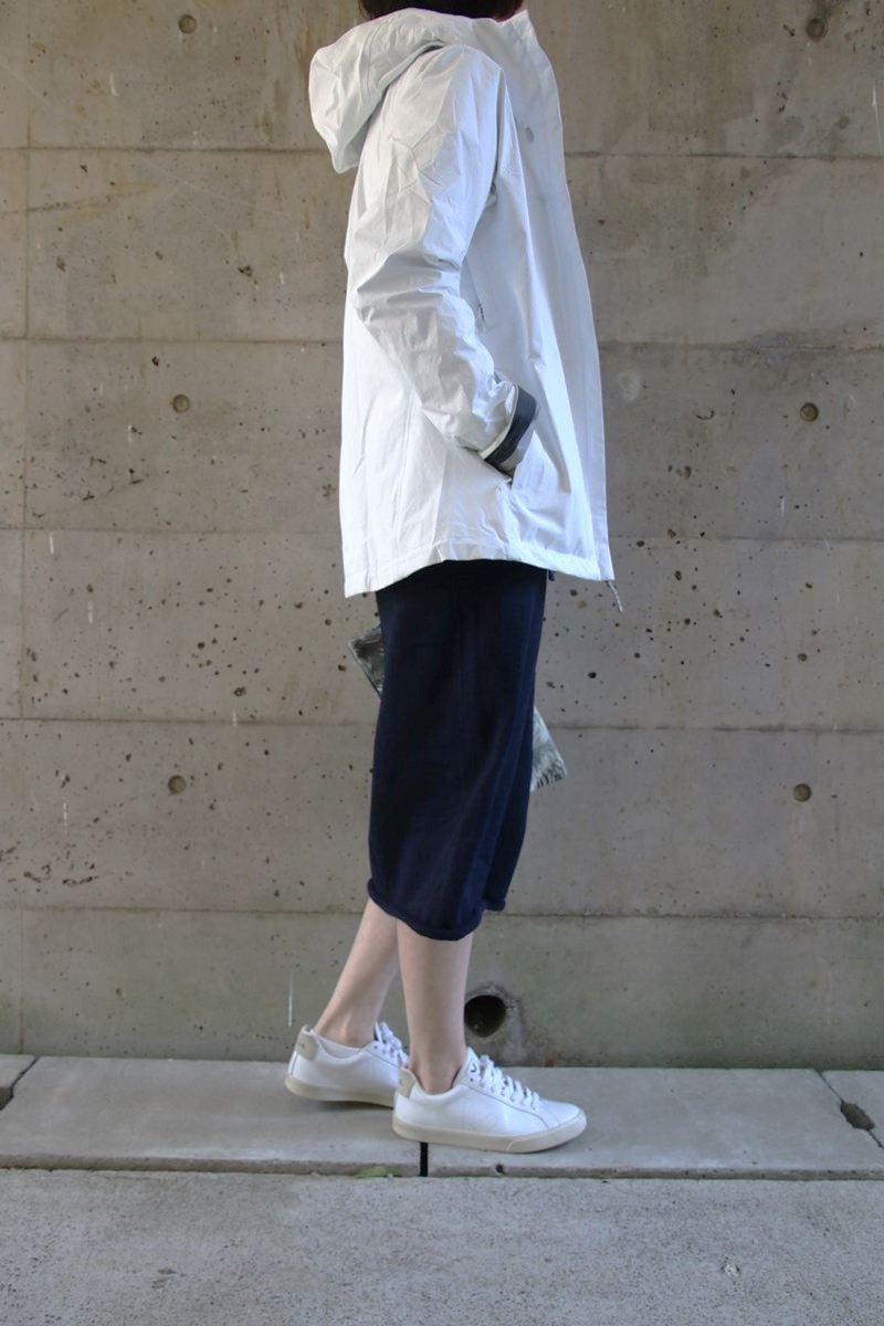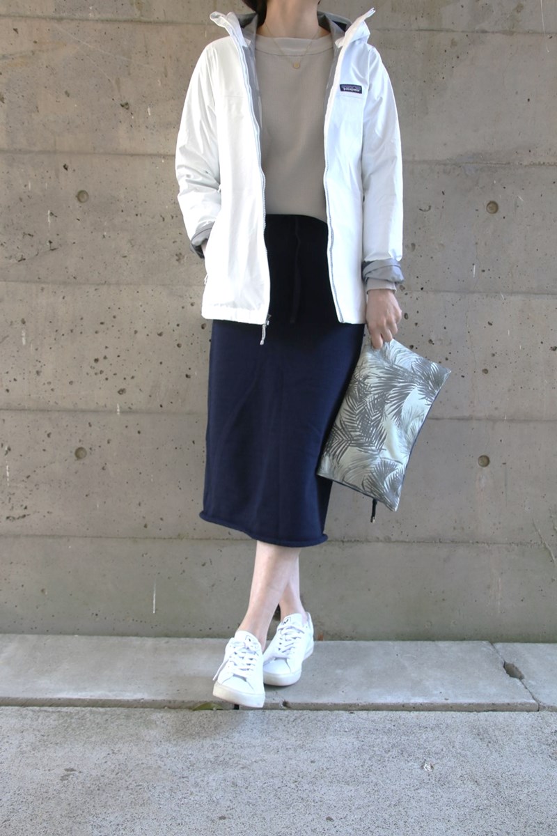 スポーティなアウターであってもきれいめな印象は残したいのが大人流です。ニットの小綺麗なインナーコーディネートに王道のpatagoniaをパサッと羽織りました。アウトドアから少し距離を置く都会的なオフホワイト、ハリがありシャリっとしたマウンテンパーカーは見栄えもよく洗練されたトータルコーディネートに仕上がりました。
