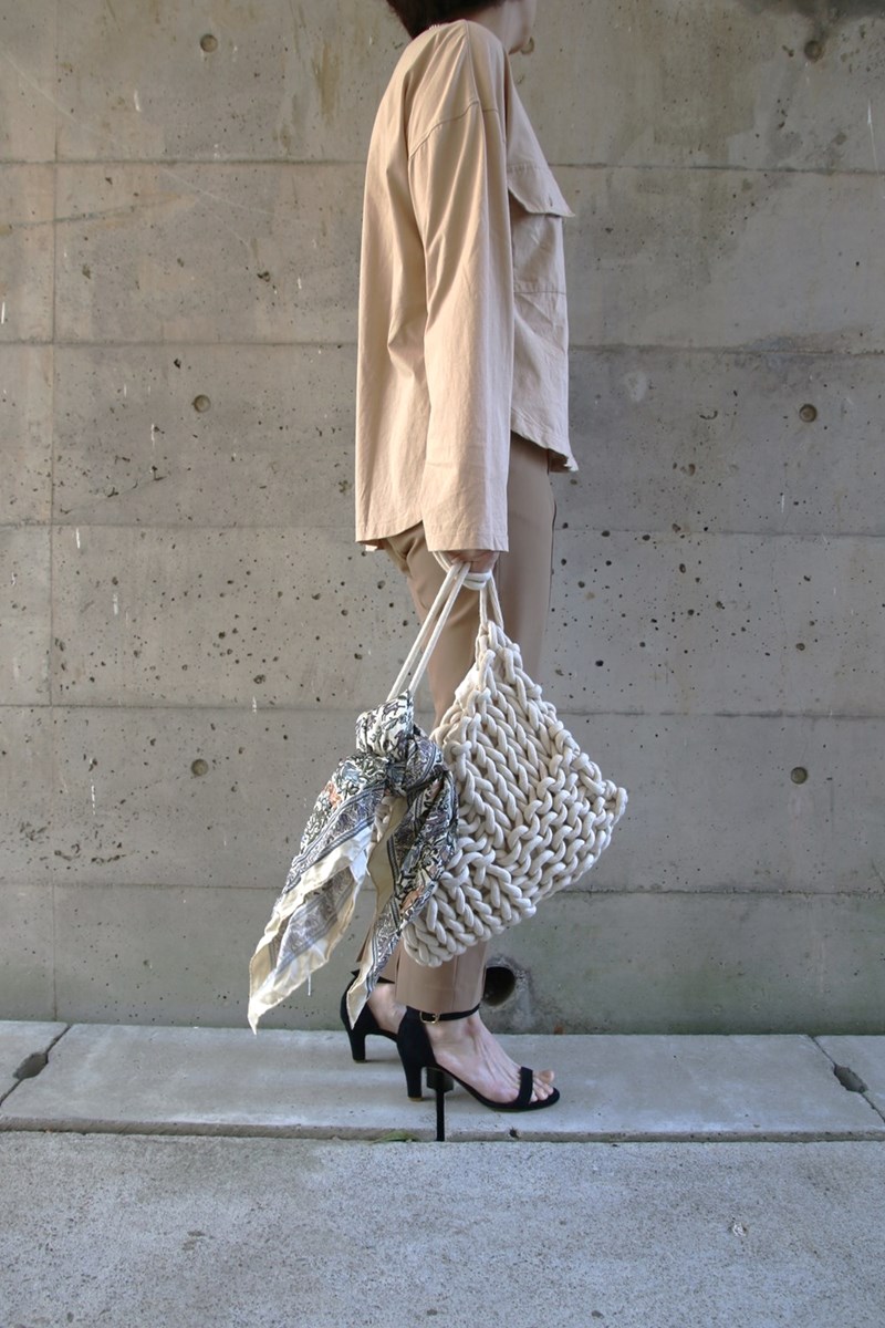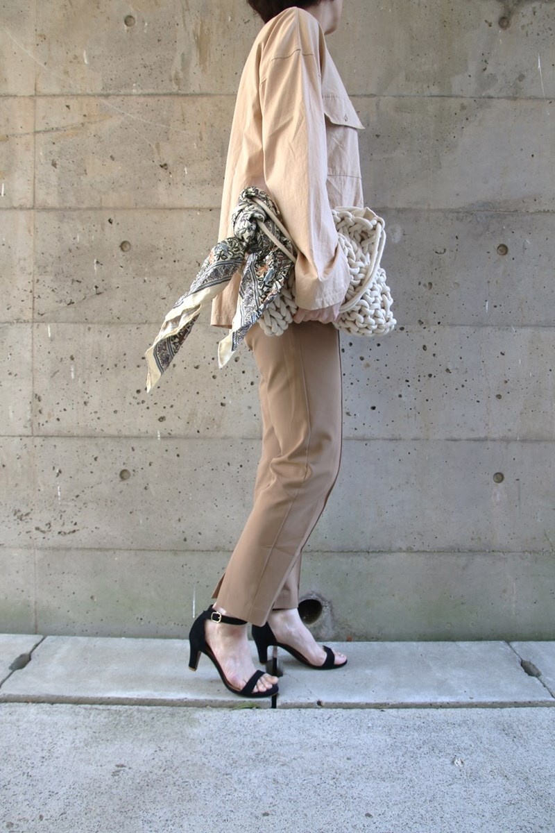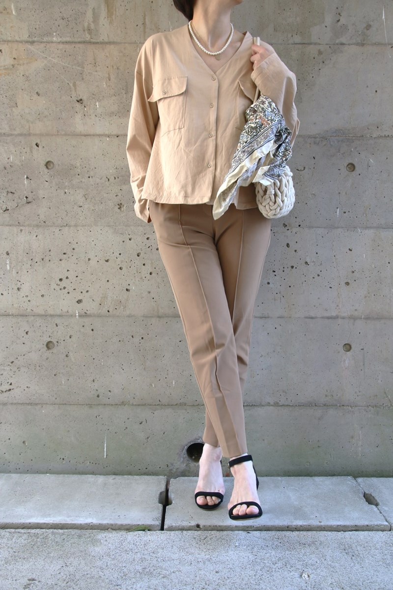 ブラウス見えするカットソー素材のシャツにしっかりストレッチパンツをコーデ。自由に小物を選べるのも魅力。バックにスカーフをキュッと結んでアクセントを付け、スカーフにちょっとだけ入った黒と足元をリンクさせました。黒でもヌーディーサンダルをチョイスすればイメージを崩さず一体感を作れます。歳を重ねた大人女性だからこそ叶うワンランクアップのオールベージュコーデ。この春はシャツを使ってトライしてみては。