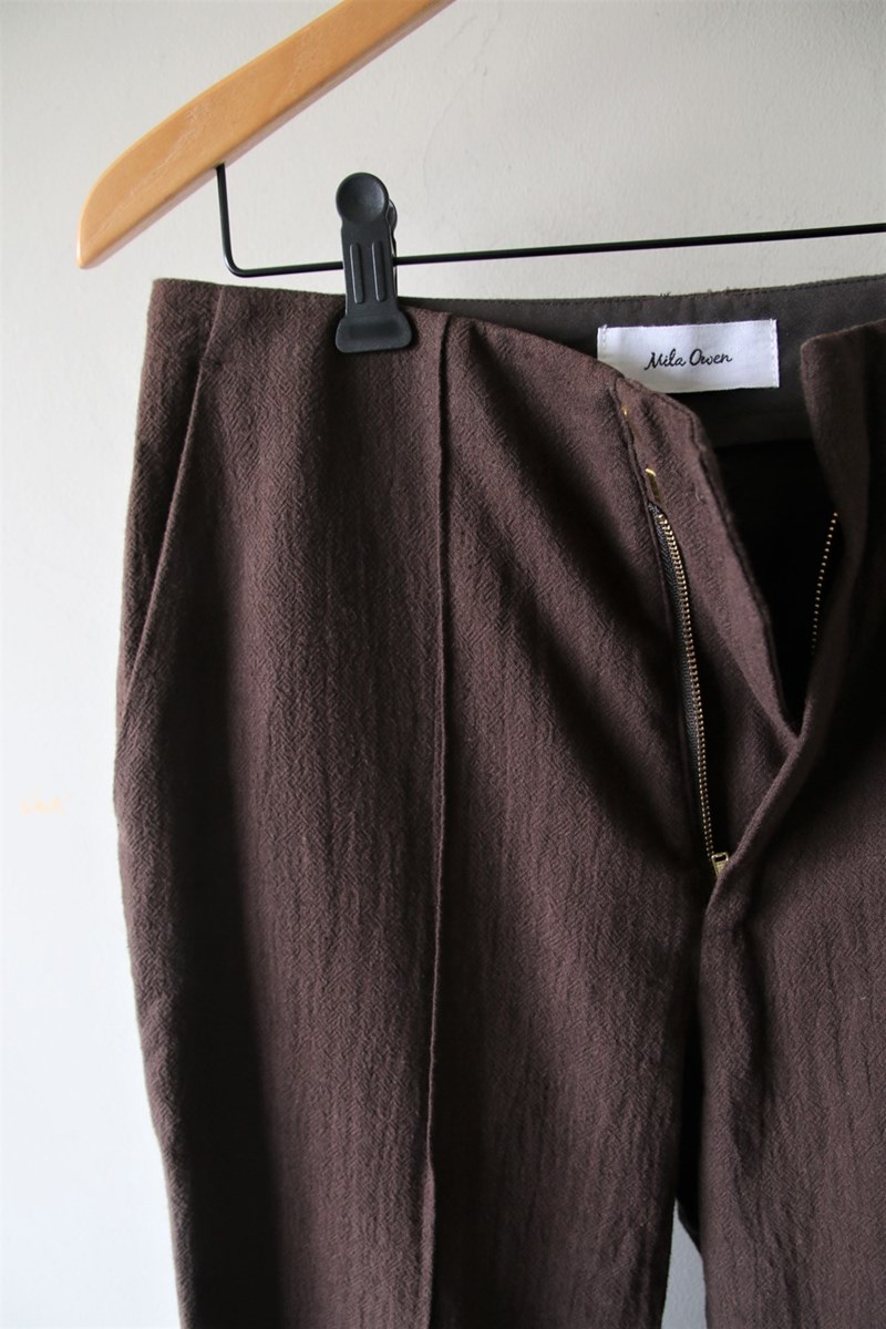 センターコバですらりとしたシルエットを描くパンツ。裾脇にデザインしたベンツは裾に向かって広がるシルエットで美脚効果があり、脚さばきが良いのも嬉しいポイント。バックスタイルにもセンタープレスを施して、360度どこから見ても美しいシルエットにこだわりました。
