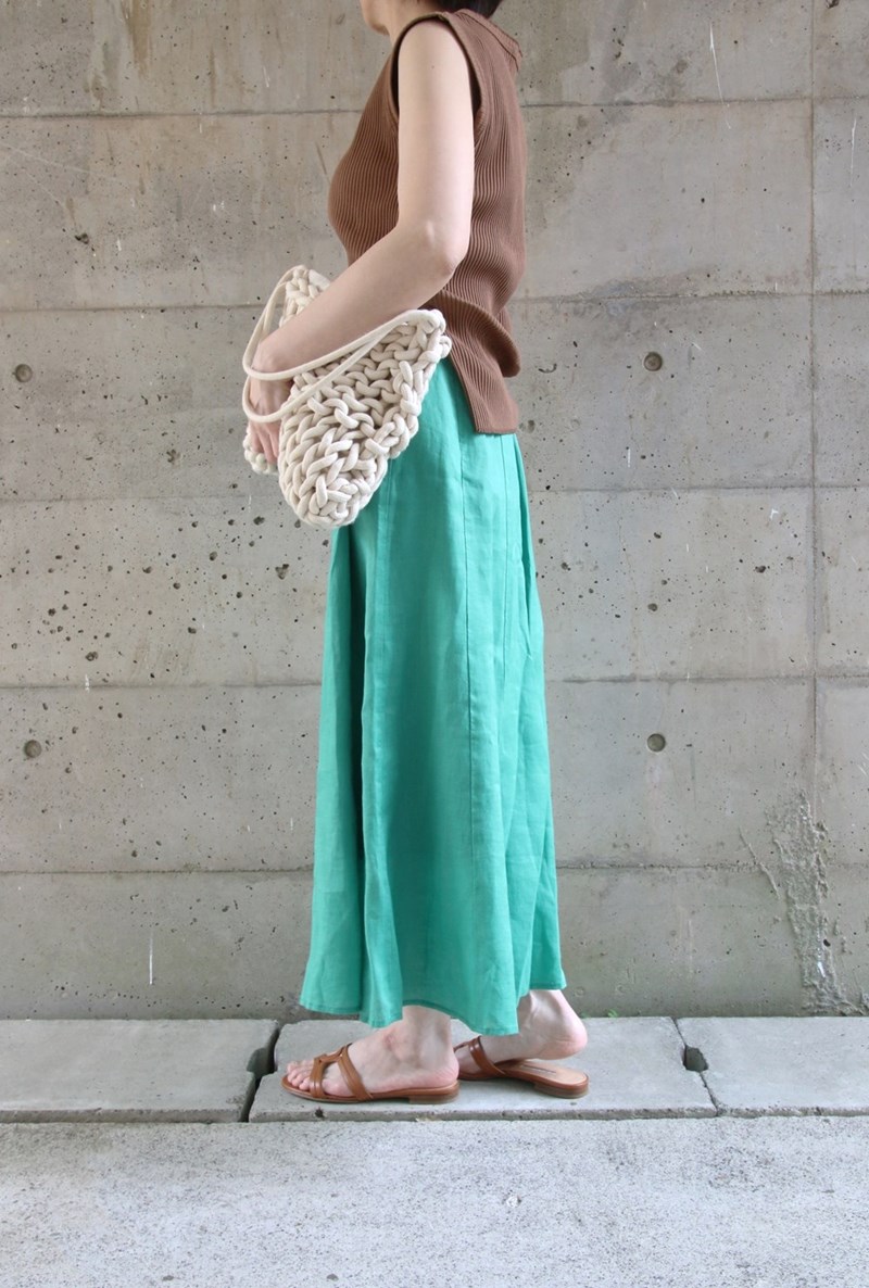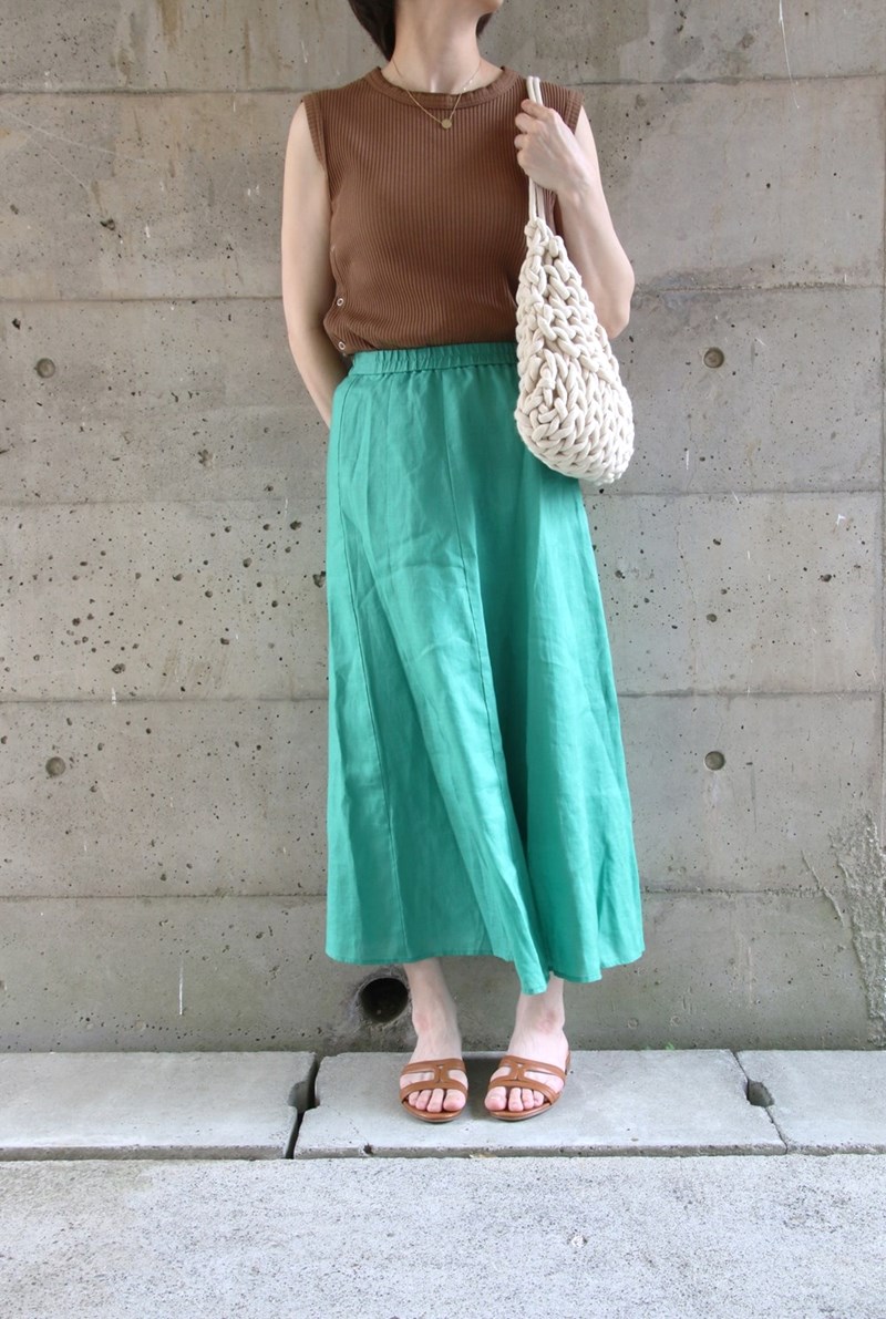 きれいなグリーンのスカートで夏の先取りコーディネートを。ブラウン系のアースカラートップスと相性がよく、大人な雰囲気を醸し出せます。ノースリーブの肌みせでもアースカラーなら自然でヘルシーな印象に。