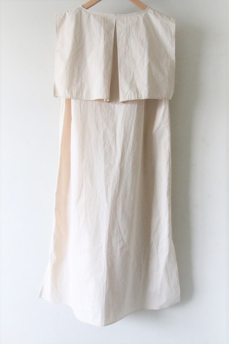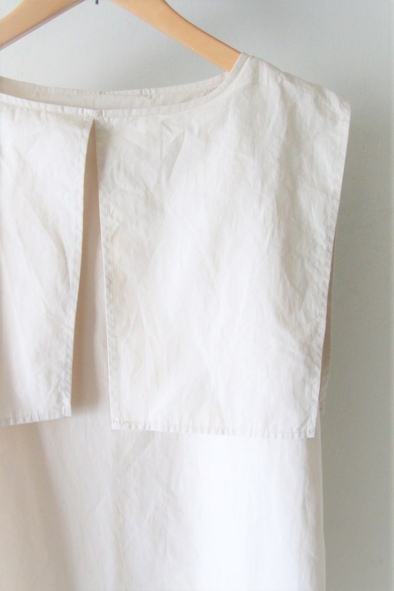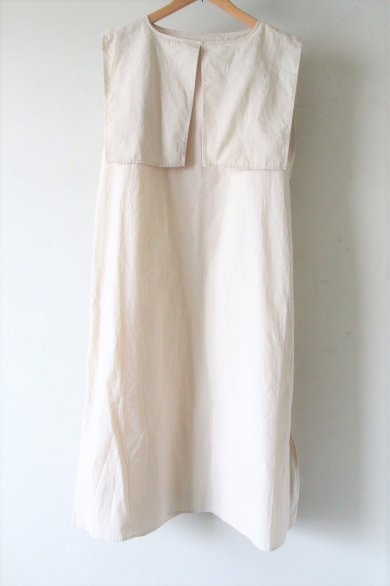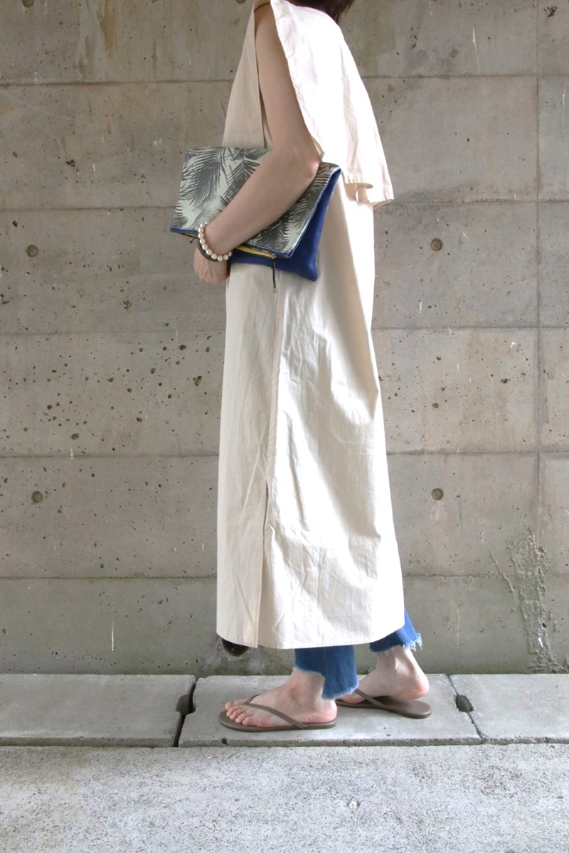 最近では落ち着いてみえるデザインも増えてきて大人世代でも十分着こなせるアイテムです。リボンやフリル、レースなどなく、衿の角も丸みのないスクエアカラーをチョイスしました。ワンピースなのでデニムをレイヤードしてすっきりみせる大人向きコーデに着地させました。甘くみえるデザインなのでカジュアルダウンさせる感覚でボトムや小物を選ぶとよいと思います。