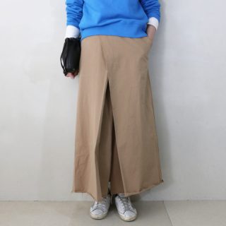 Monameのイージースリムパンツ。テーパードとワイドの中間の太さの新シルエットです。 生地は肌面を起毛しているため、脚を通したときのヒヤッと感がありません。柔らかいペールトーンのカラーのコーデュロイです。