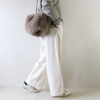ヒップや太腿サイズ、裾幅でガラリと印象が変わるアイテムなので、何本かあるとその日の気分やトップスとのバランスで選べます。今回はPlageのリブワイドパンツを使いました。滑らかで柔らかめの穿き心地満点の素材。