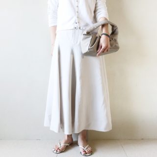 もしニットを合わせるならカジュアル見えするざっくり編み地のニットも可愛い。色物にも相性がよく、赤、パープル、オレンジ、イエロー、グリーンなど着たい色のニットにもスッと馴染み活躍します。すぐにワードローブに追加したいスカートです。
