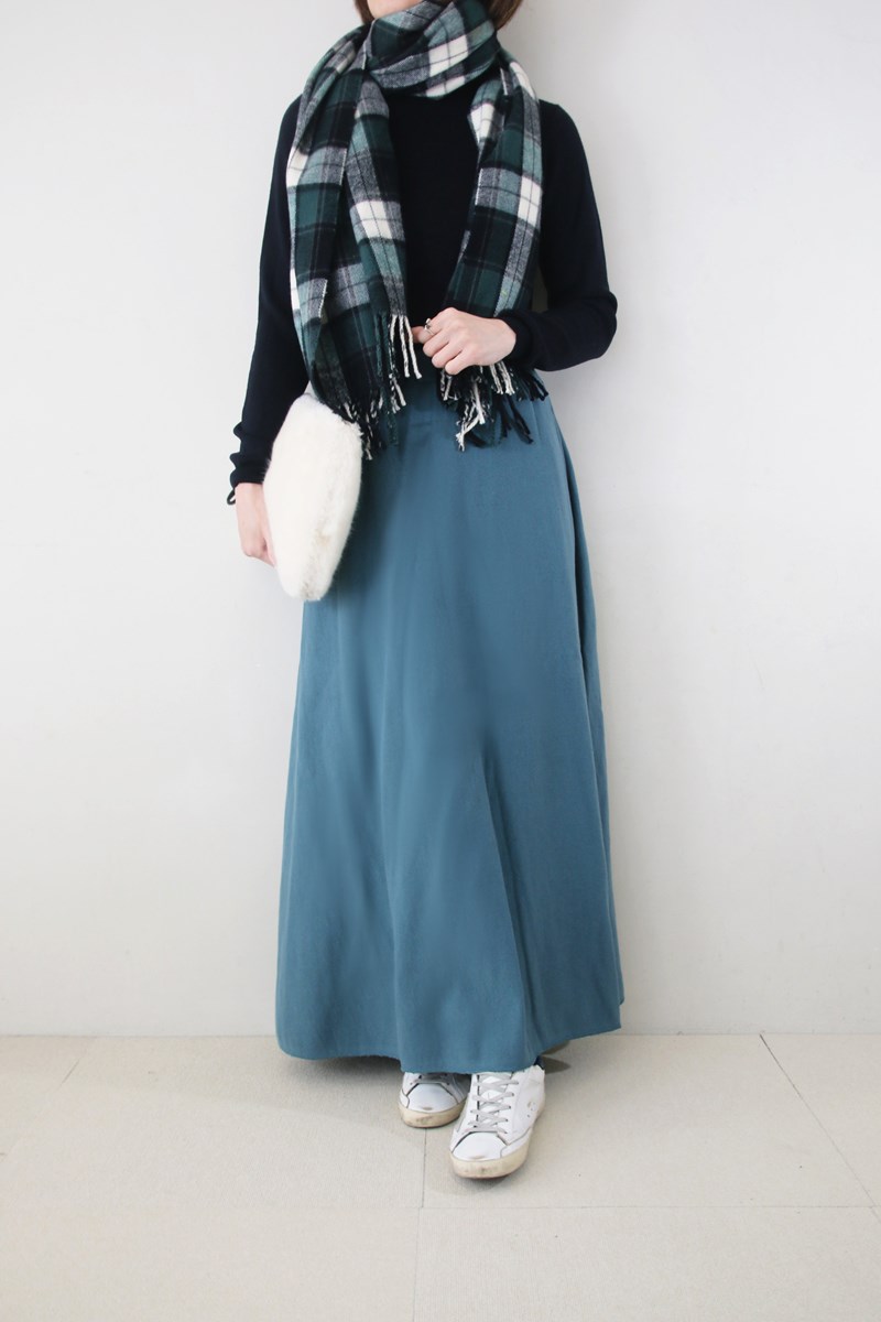 楽ちんなのにキチンと感を意識したトップス選びをすればスウェットスカートでも大人っぽくスタイリングができます。カラーバランスの調整にぴったりのチェックストールをセットにしました。
