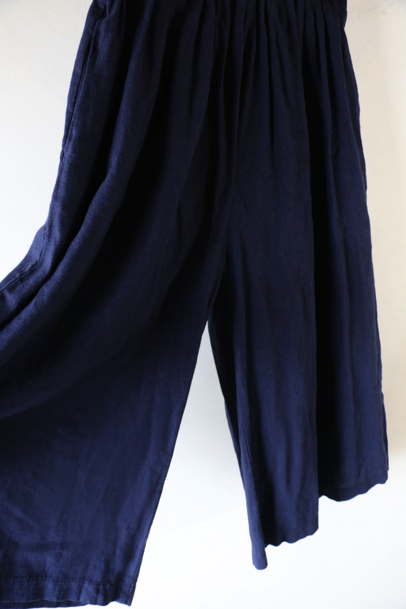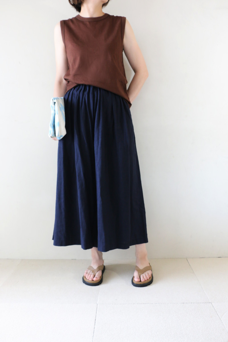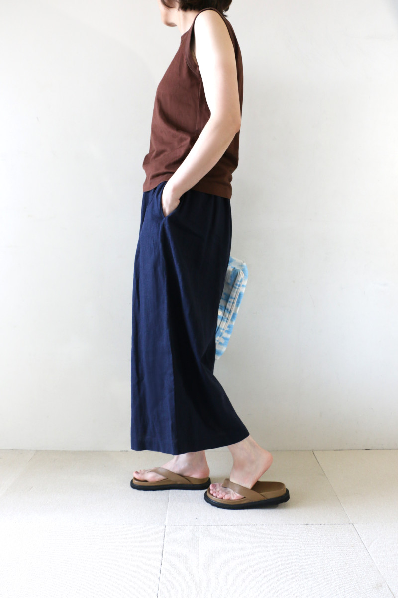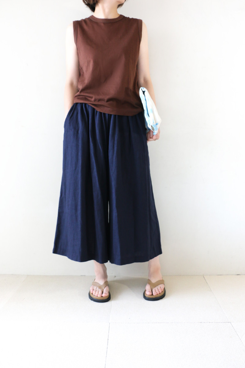 涼しげ素材のリネンMIXロングキュロット。明るめネイビーが真夏のスタイルをムードアップ。タンクを合わせてスッキリそしてクールにコーディネート。