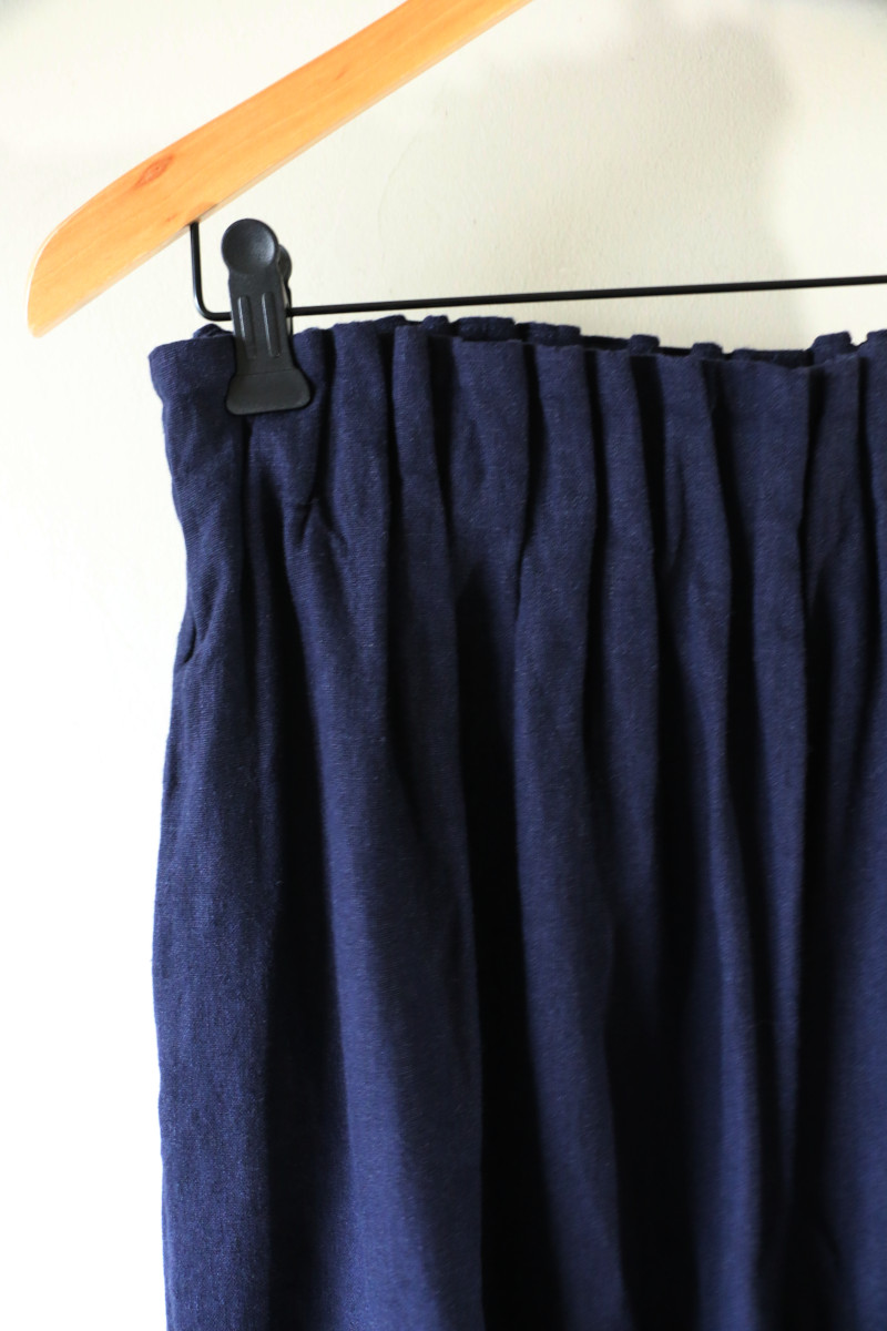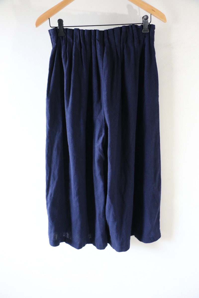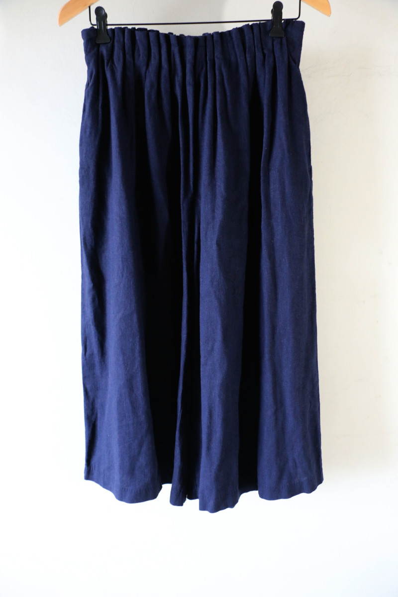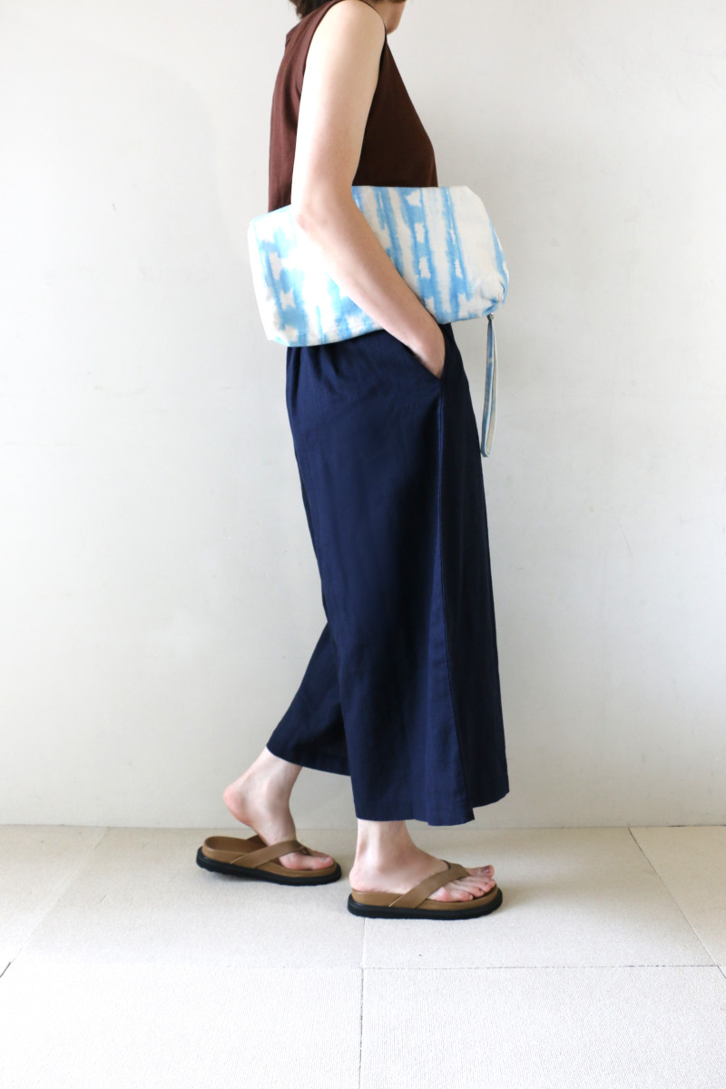 涼しげ素材のリネンMIXロングキュロット。明るめネイビーが真夏のスタイルをムードアップ。タンクを合わせてスッキリそしてクールにコーディネート。
