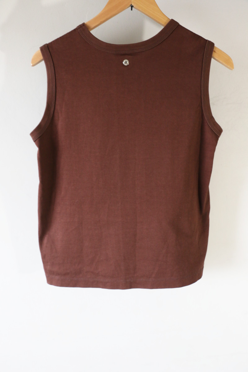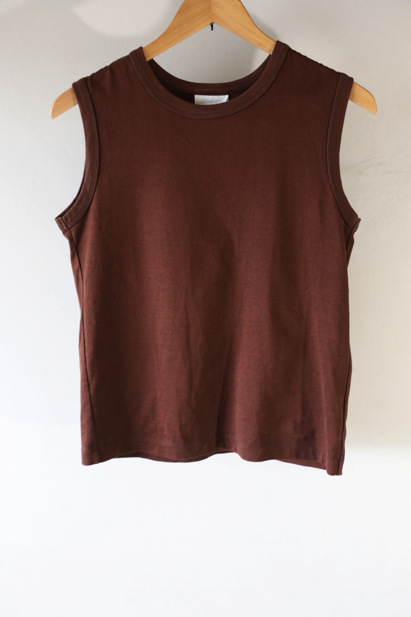 ぴったりし過ぎず、でも無駄のない完璧なサイジングのCINOHタンク。後ろのスナップもちょっとしたアクセント。色違いで何枚も集めた中の1枚をセットにしました。