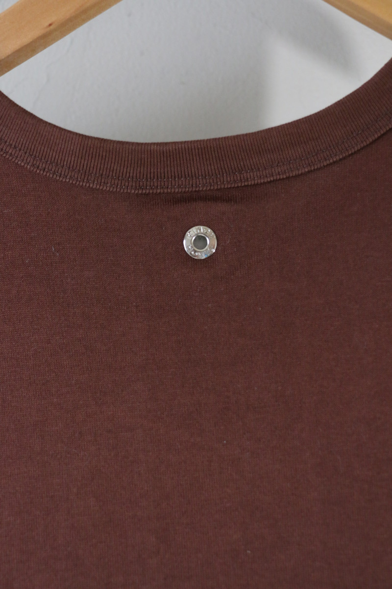 背中のリベットが印象的な継続的に販売されるCINOHの定番ノースリーブカットソーです。CINOHの頭2桁は年代を表しており、販売品は現行製品と同一製品の年代違いかと思われます。(Rakutenでの販売商品=23SCU004)。2024年はボルドーも販売されており、品番が一つ変わりましたが24SCU005となっています。小さな変更があったのかもしれません(公式)。なお、定番素材(=高密度天竺)を押して今年から製品名に”REFINA”(参考記事)と名付けています。