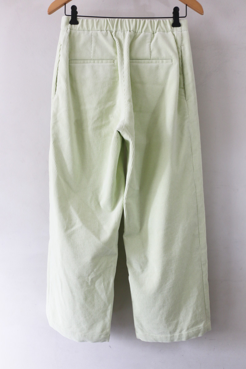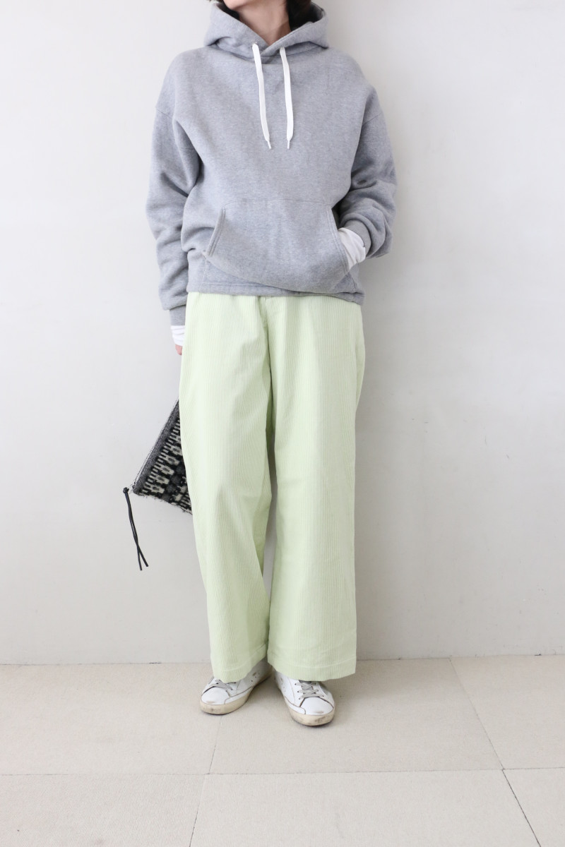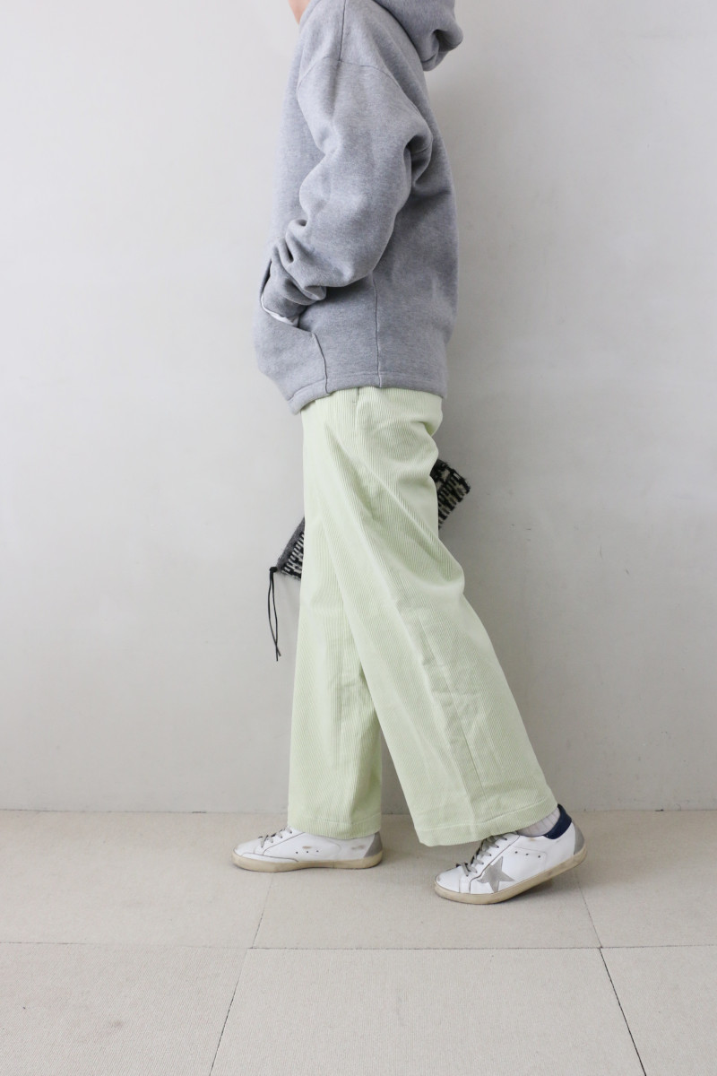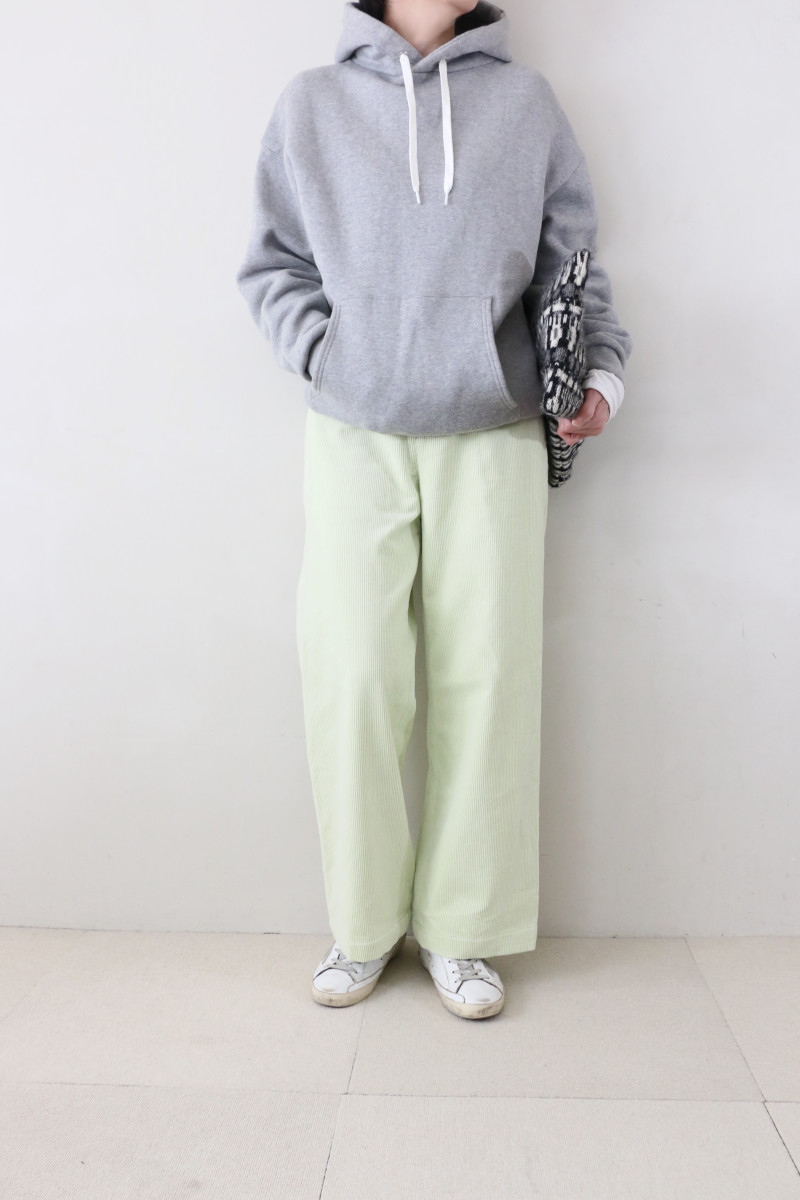 定番のコーデュロイ素材のパンツ。タテ糸に使用している上質なインドコットンは油分が多く独特なぬめり感があり、しなやかなドレープ性とソフトで滑らかなタッチが魅力です。特殊な加工を施すことで、何度も洗いをかけたようなラフな風合いに仕上げました。リラックス感のある絶妙なストレートシルエットでこなれ感のある雰囲気に。バックウエストにゴムを使用しているので穿き心地の良さは抜群です。合わせるトップスを選ばず、秋冬の着こなしで幅広く活躍してくれる万能なアイテム。ペールトーンで優しいカラーの4色展開です。