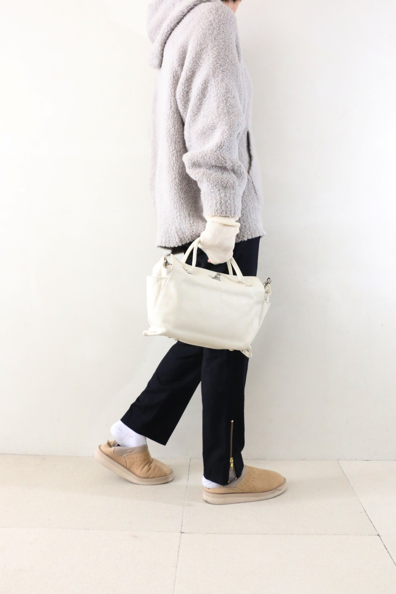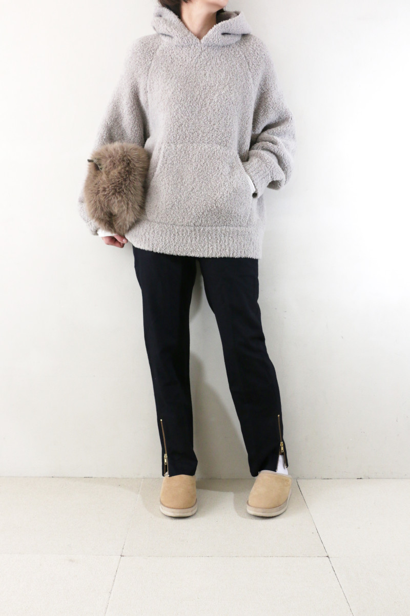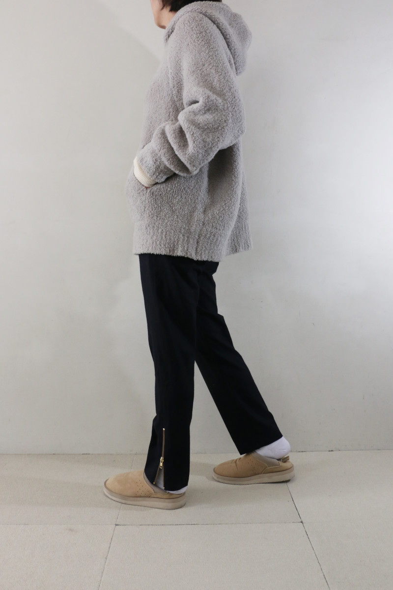 パンツはウールでもすっきり見せてくれるドゥーズィの大人気パンツを。トップスのボリュームをバランスよくkeepし、脚長効果も抜群。裾のジップの上げ下げで靴合わせもラクラク。キレイめにも後押しできるパンツとして人気は継続中です。