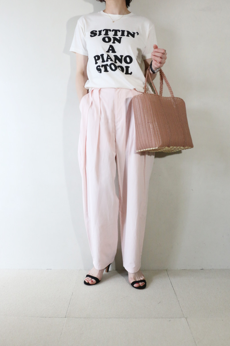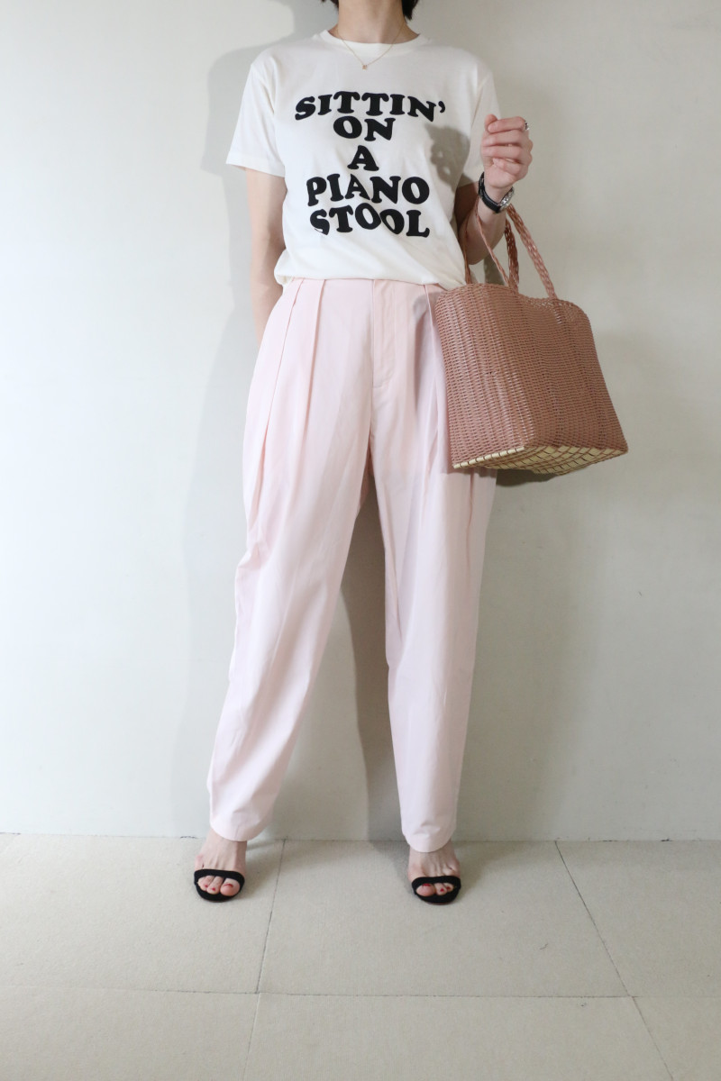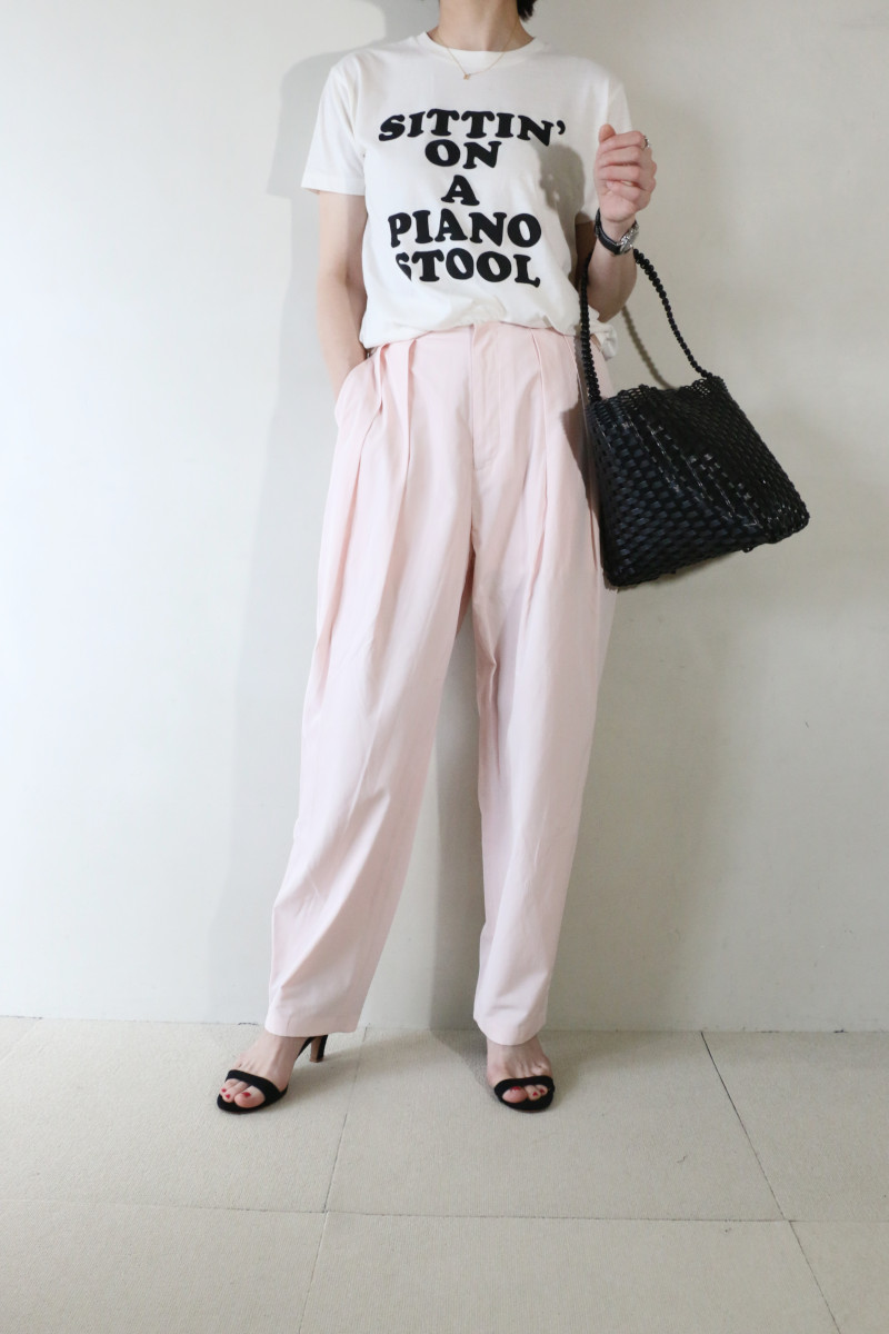 ”ロゴT×ピンクパンツ”。いつものパンツをピンクに変えることでファッション鮮度を一新。品の良さとカッコ良さを併せ持つ淡いピンクのタックパンツを主役にコーデしました。