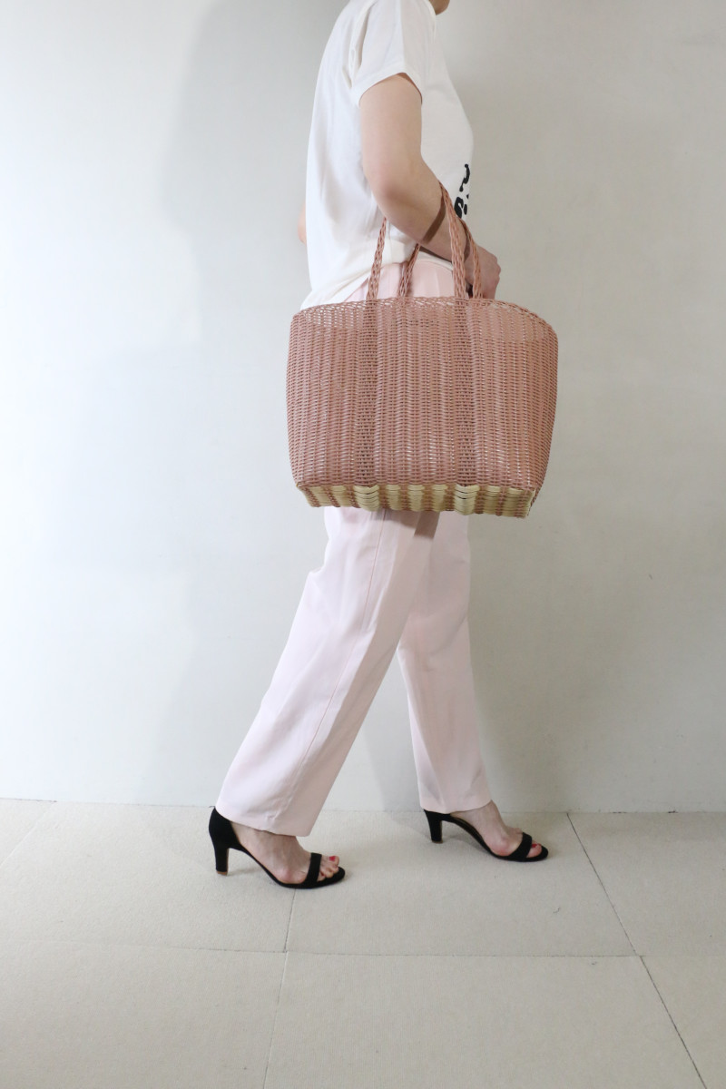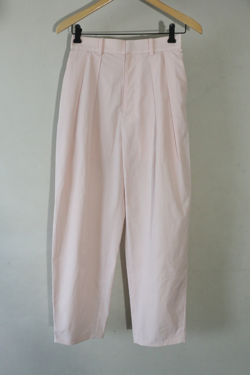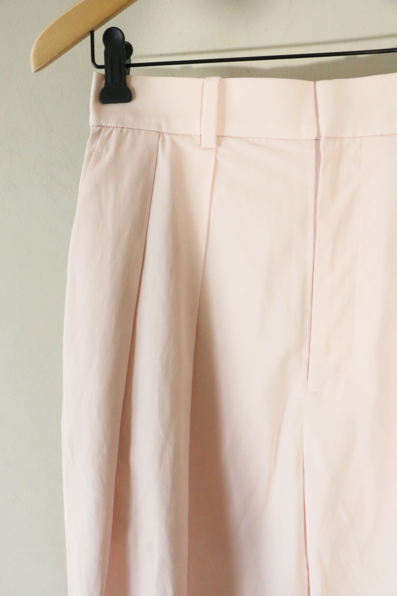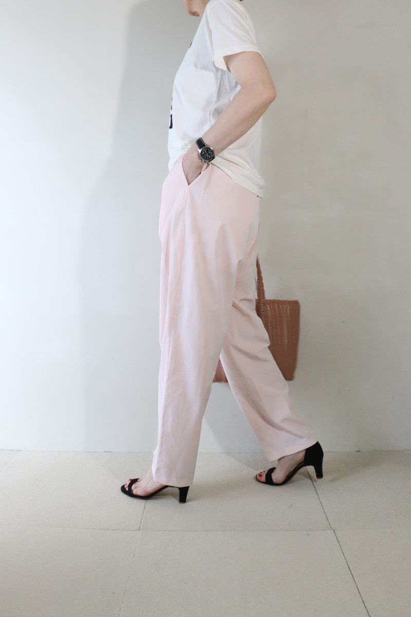 ”ロゴT×ピンクパンツ”。いつものパンツをピンクに変えることでファッション鮮度を一新。品の良さとカッコ良さを併せ持つ淡いピンクのタックパンツを主役にコーデしました。