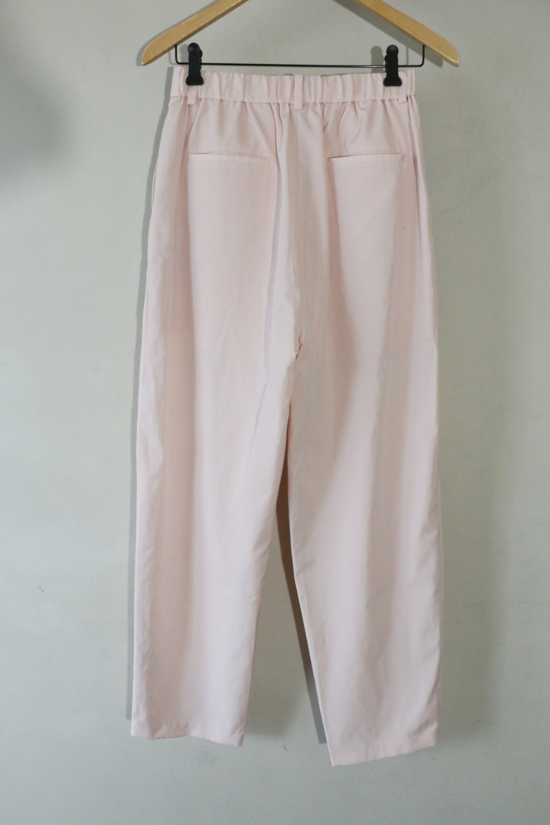 今季トレンドのナイロン風の素材で仕上げた、きれいめなダンディパンツ。ウエストは後ろゴムで履き心地もよく、ベルトループはイージーすぎない見え感に。程よい適度なツヤ感と落ち感で、カジュアルさを回避、大人が着やすいように仕上げました。カラーリングで女性らしさも意識しました。タイトめなトップス、特にアシメネックオーガニックリブニットトップス(品番09WNT241087)と合わせるとバランスよく決まるのでおすすめです。