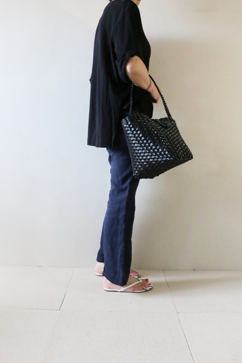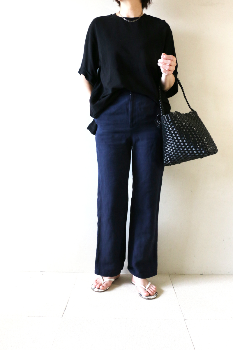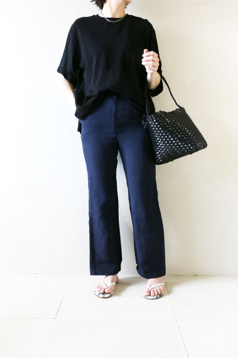 重たい色同士の黒×ネイビーは同系色の中でも難しい組み合わせですが、コーディネート次第でグッとクラスアップできる色合わせです。