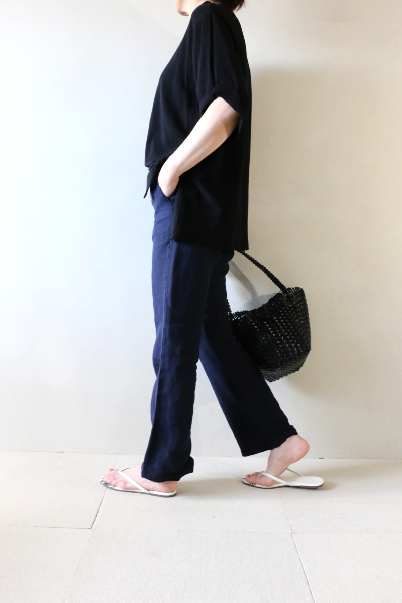 R/Pウォッシャブルハーフパンツと同素材のイージーパンツ。裾フレアのすっきりとしたシルエットです。通常レーヨンは縮みが洗えないものが多いですが、レーヨンの糸をカバーリングしたマットクロス素材は手洗い可能です。オフィシャルはもちろんですが、カジュアルにも合わせるのもおすすめ。Tシャツや洗いのかかったナチュラルなシャツやブラウスと合わせたり、コンフォートなサンダルやスニーカーとも合わせやすいシルエットです。シリーズもございます。