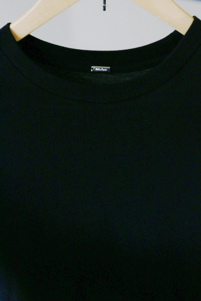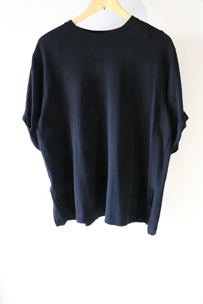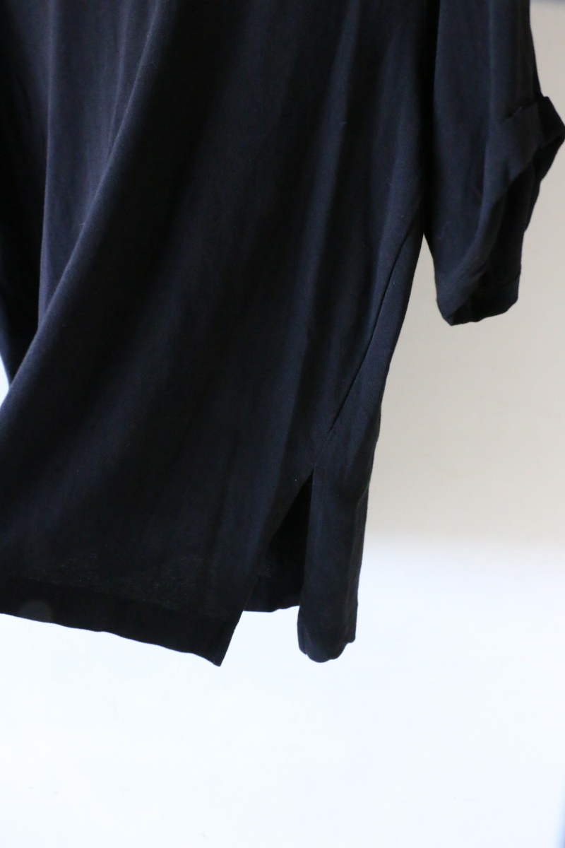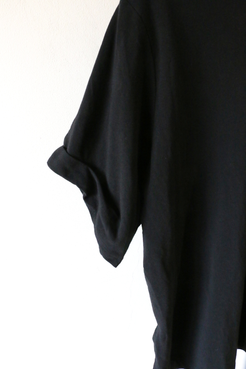 ドロップショルダーと、丈を長めに設定したオーバーサイズTシャツ。袖口をロールアップしたようなデザインで、立体的なアクセントを添えました。