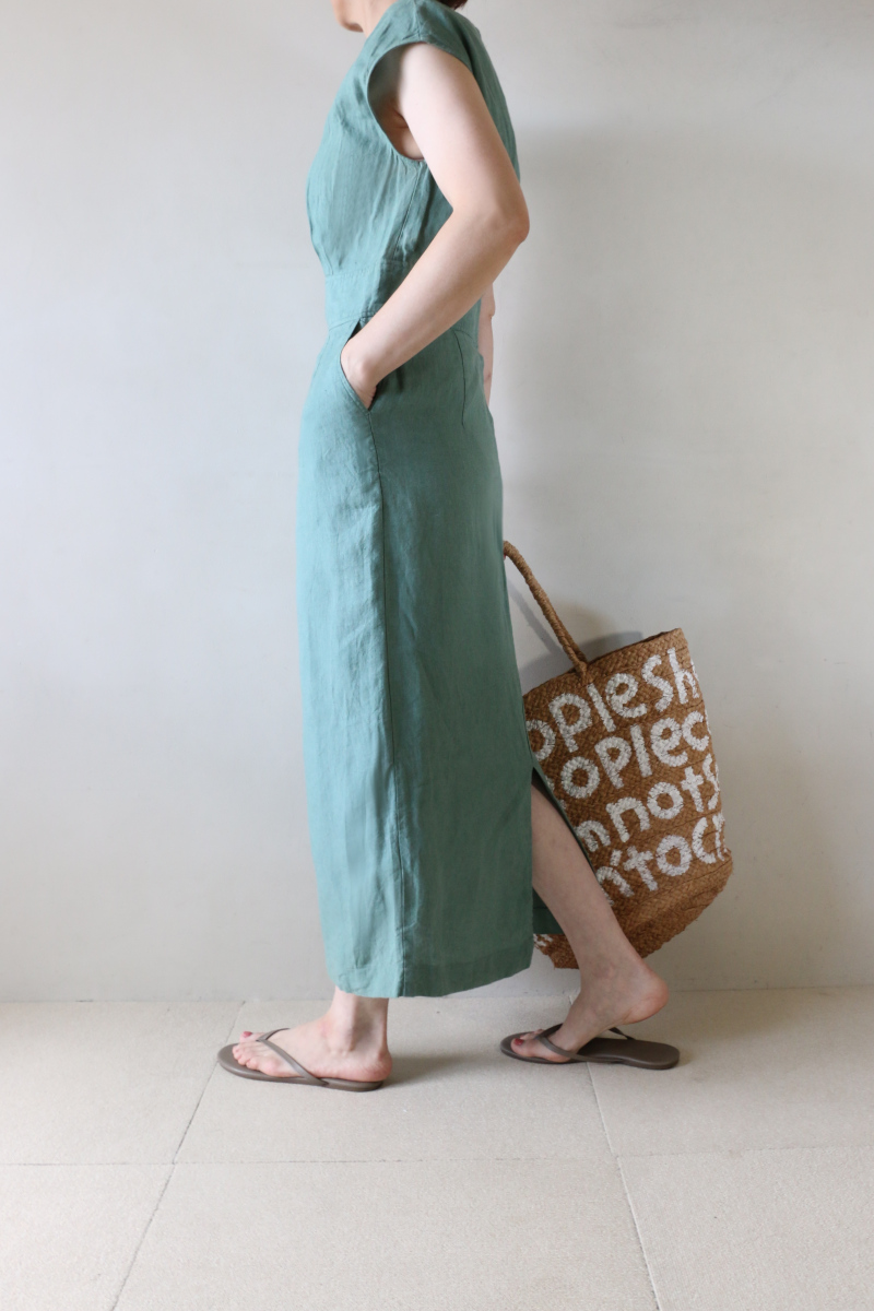 凉しく、きれいめなリネンワンピース。ラフなサンダルで、肩肘はらず、さらりと着こなせば、自然に引き算スタイル完成。