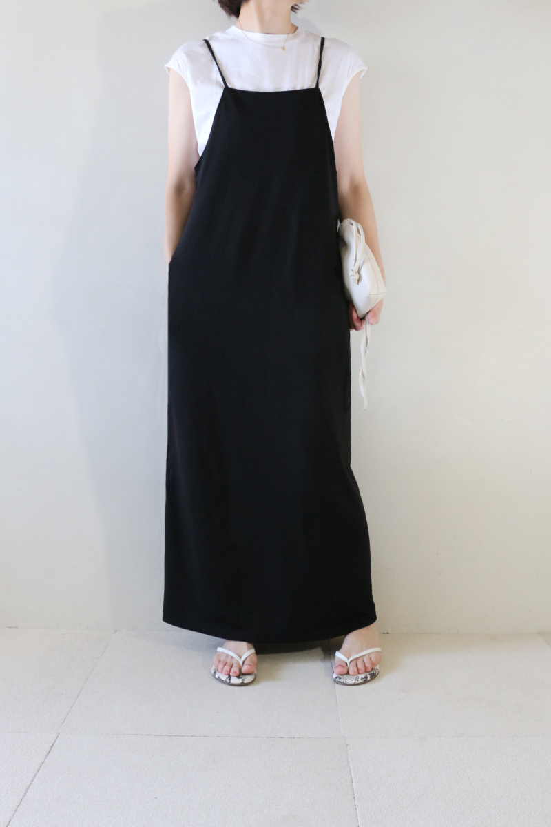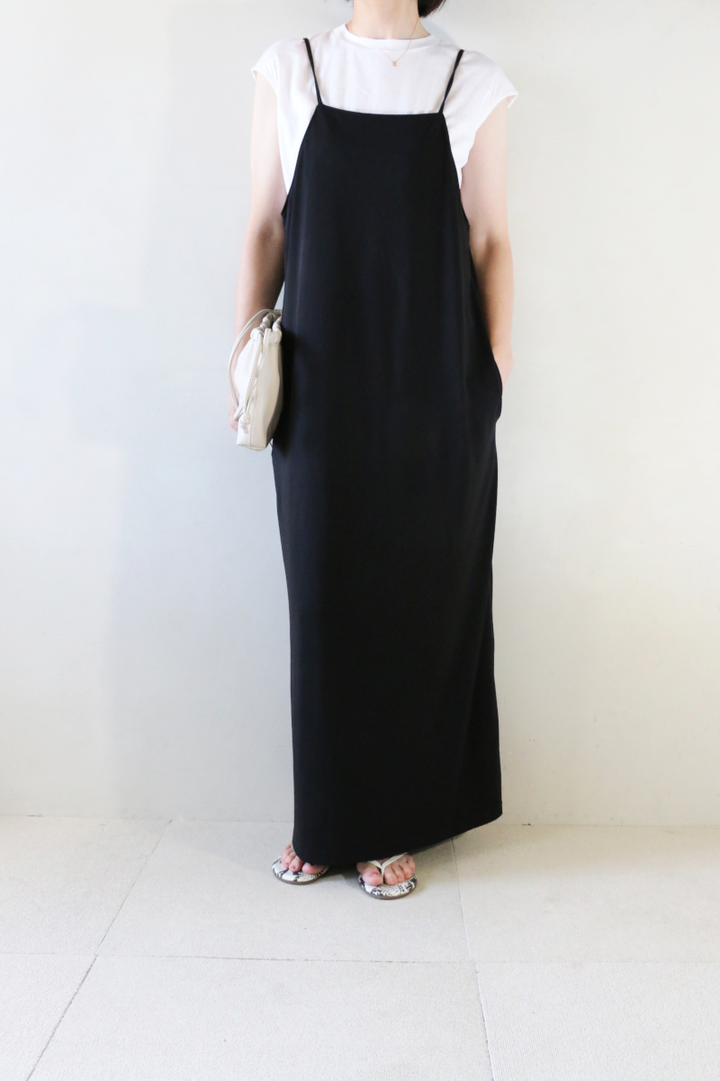 今回セレクトしたキャミワンピースは落ち感があり、大人っぽく着こなせる一枚。体のラインはカバーしてくれるルーズなシルエットですが、広がりを抑えるとろみ感が品良くこなれる。アメスリやタンクで辛口に合わせるのもオススメです。