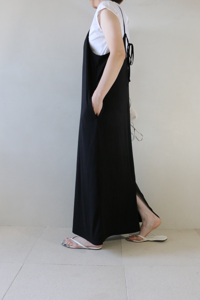 着心地抜群の柔らかなジャージー素材を使用。リラックス感がありながらも縦ラインの美しいシルエットでスッキリと女性らしい印象です。バックのリボンがアクセントに。肩紐で長さ調節が出来るのでシューズに合わせて着丈を変えられるのも嬉しいポイントです。さらっとした素材感で夏まで活躍間違いなし!