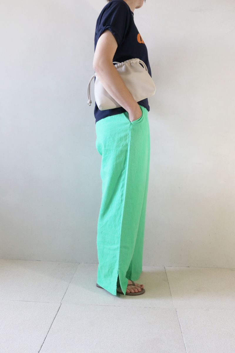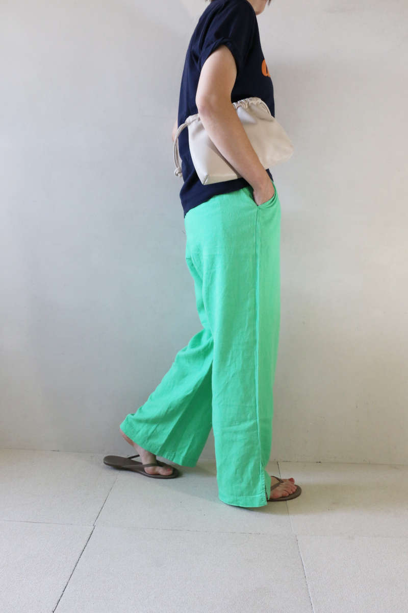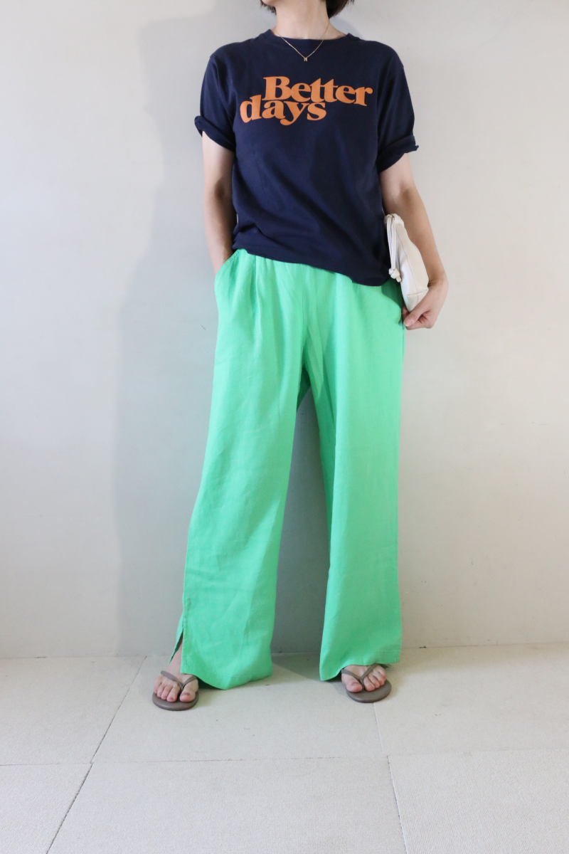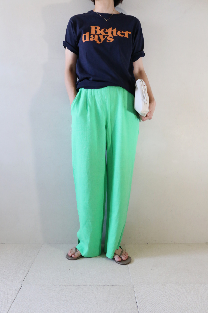 夏の日差しに映えるカラーパンツで1日元気になれるTシャツ×リネンのワンツーコーデ。涼しいリネン素材のリラクシーなゆったりシルエットのパンツは猛暑日に迷わず手にとれます。