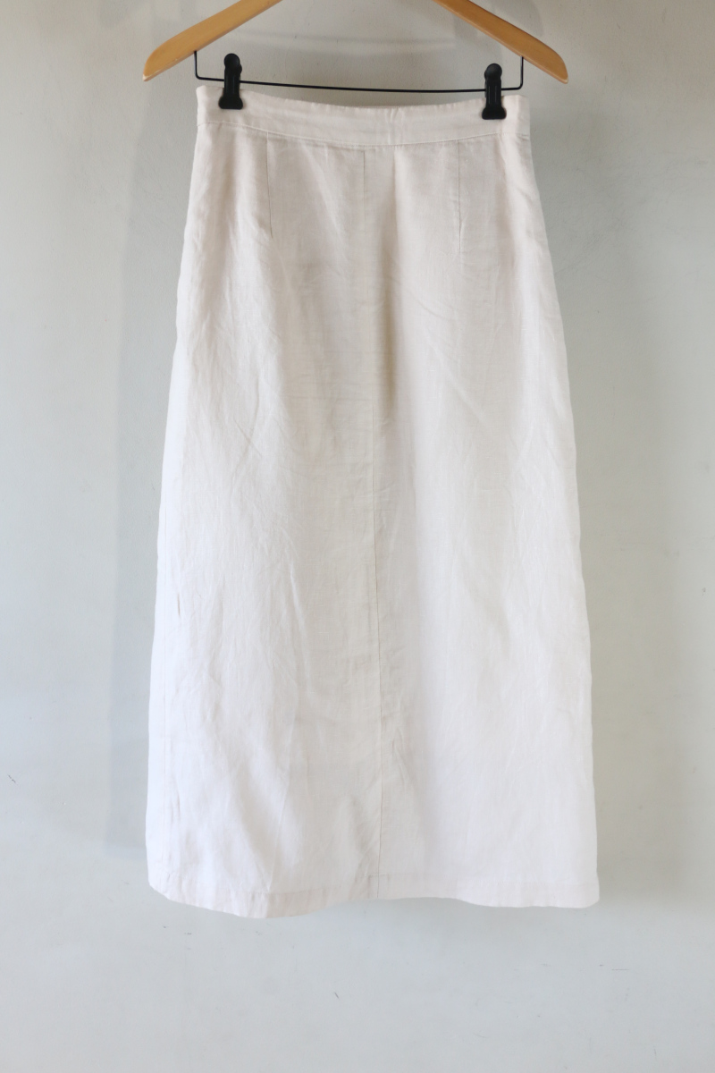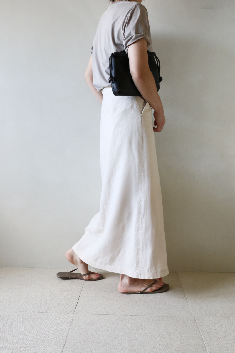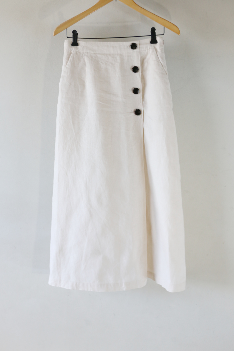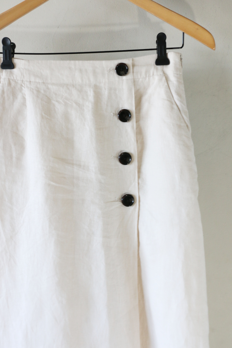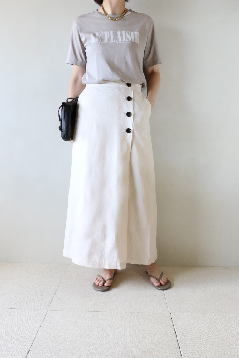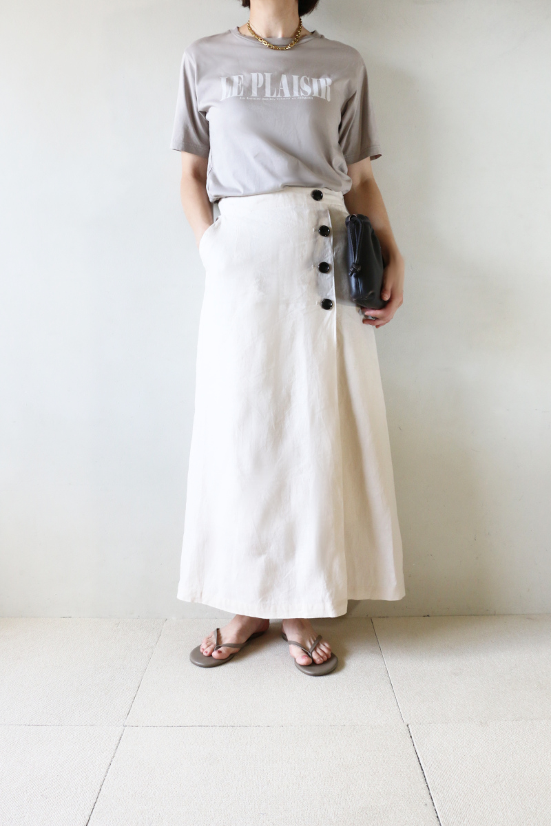トレンドのボタンディテールが特徴のタイトスカート。 麻素材で清涼感があり、これからの季節に大活躍間違いなしの1枚! 合わせやすいネイビーとナチュラル、夏らしいオレンジをご用意しました。 シンプルながらも、ラップデザインでアクセントをプラス。 やや裾広がりのシルエットが女性らしさを演出してくれます。 Tシャツやボーダー合わせでラフな着こなしはもちろん、シャツ合わせできれいめなスタイルにもぴったり◎ ご家庭でお洗濯ができ、デイリーに気兼ねなくお使いいただけます!