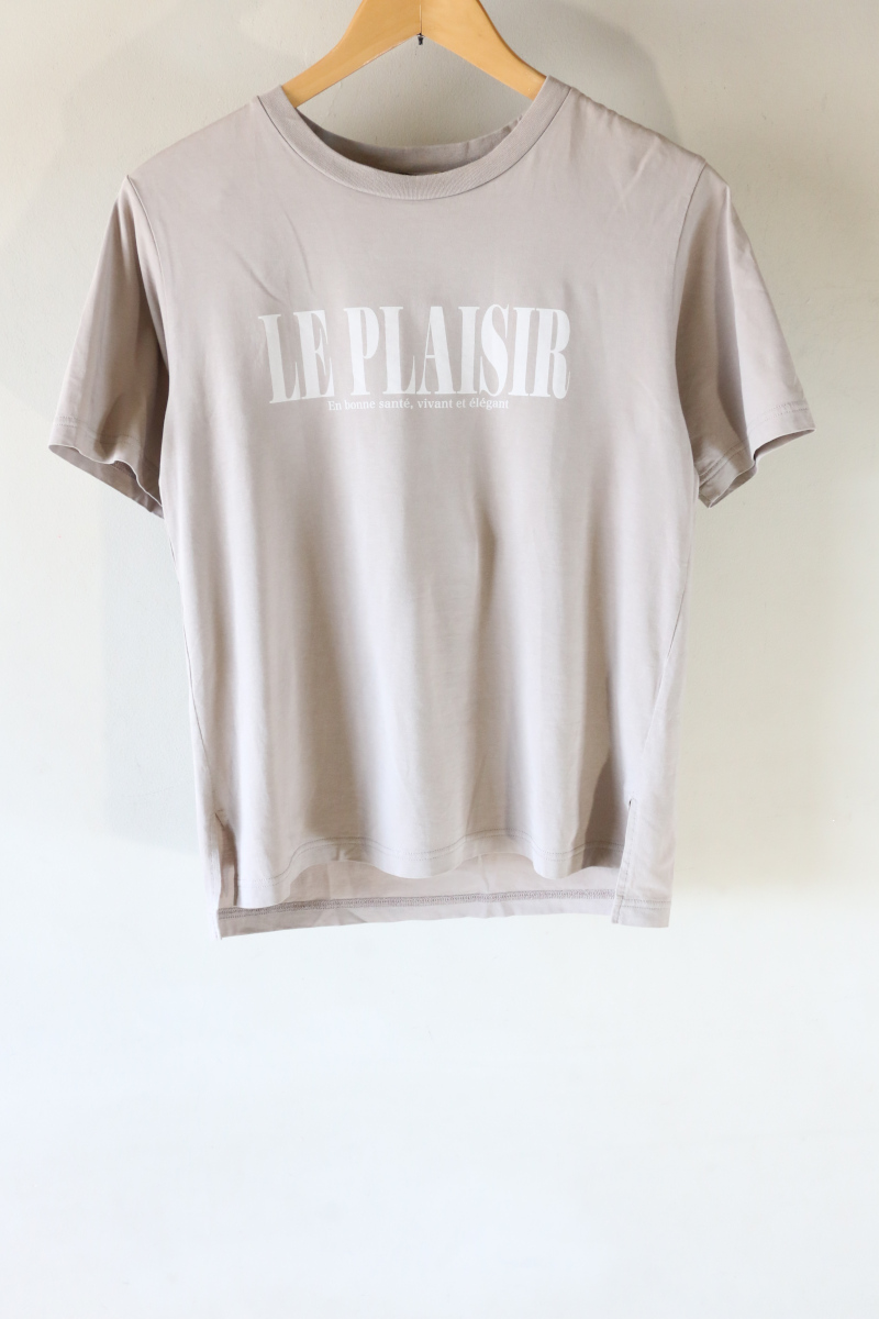 フランス語でPLAISIR(プレジャー:喜びの歓喜の意味)のロゴプリント。シンプルでルーズすぎないゆるめなシルエットで、ヒップにかかる着丈です。細番手のドライタッチのシルケット加工を施した天竺生地を使用。(シルケット:生地表面の毛羽を取る加工)毛羽を取っているので洗濯後の毛羽も出にくいです。