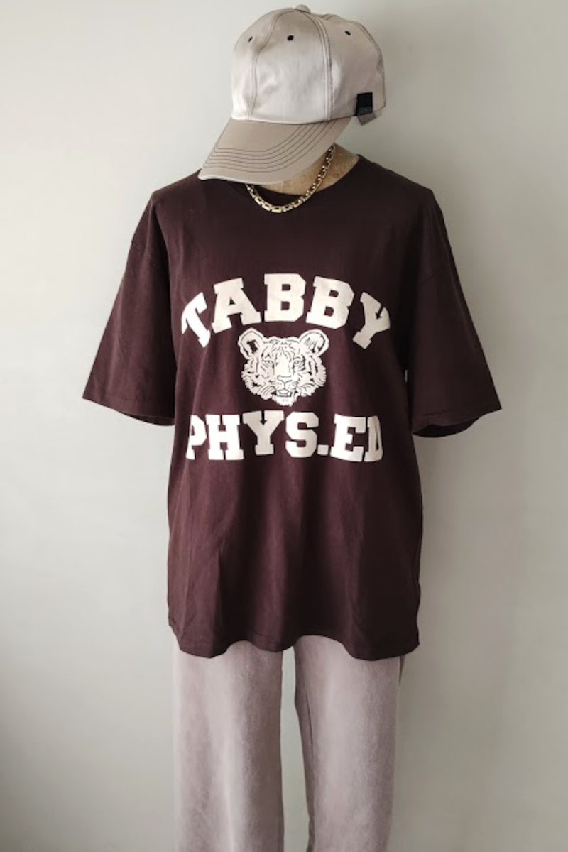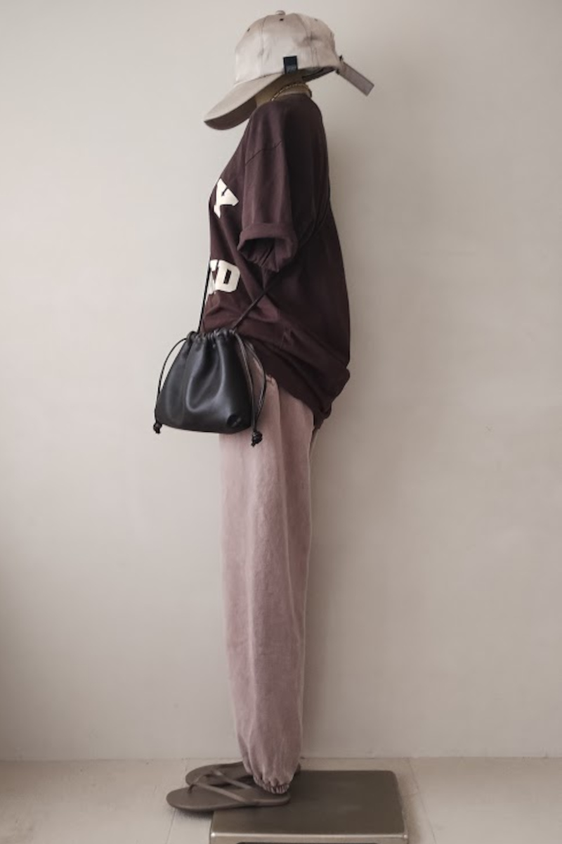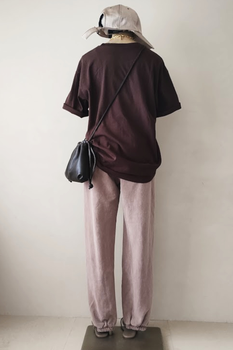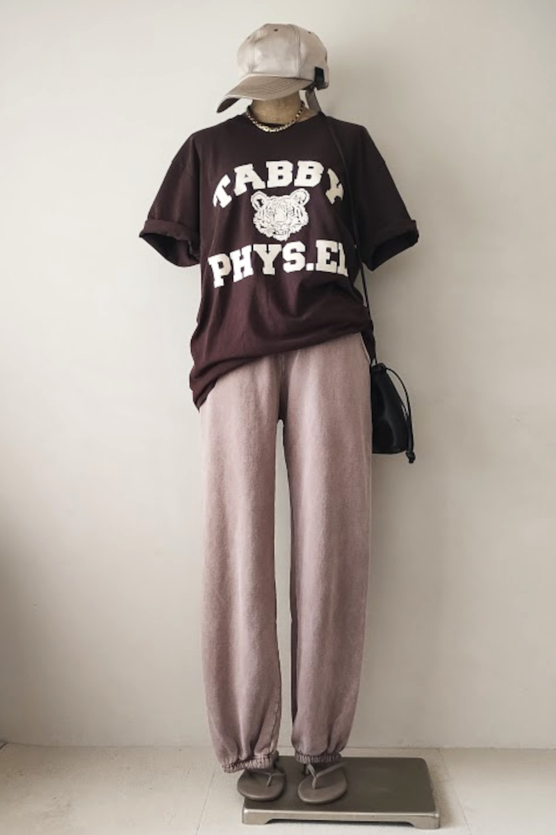 Tシャツ×スウェットパンツのTシャツデイリーコーデ。クラスアップ間違いないなしのLOS ANGELES AP PARELのパンツをセレクト。色落ち具合が絶妙で履くだけでこなれる!ピッタリしすぎないややゆったりしたサイジング。ニュアンスのある雰囲気が出るように、今の気分に合わせて形から色選びまでこだわりの詰まった1枚。穿き込んでいく過程でさらに馴染み、エイジングしていく変化を楽しめます。Tシャツはブラウンをセットにしました。ミクスタではおなじみの「TABBY」プリント。秋冬のレイヤードにも重宝しそう。