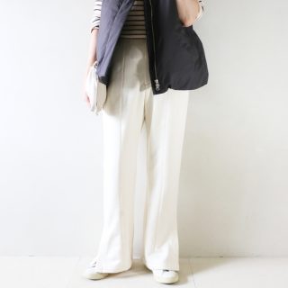 デニムは人気のアッパーハイツデニムを選びました。センタープレスが足長効果を発揮し、ヒップと腿がすっきりとし、ややフレア気味の裾幅が冬のオーバーニットにもバランスよくコーデできます。ざっくりニットなどビッグトップスが主流のスタイリングに欠かせない1本です。