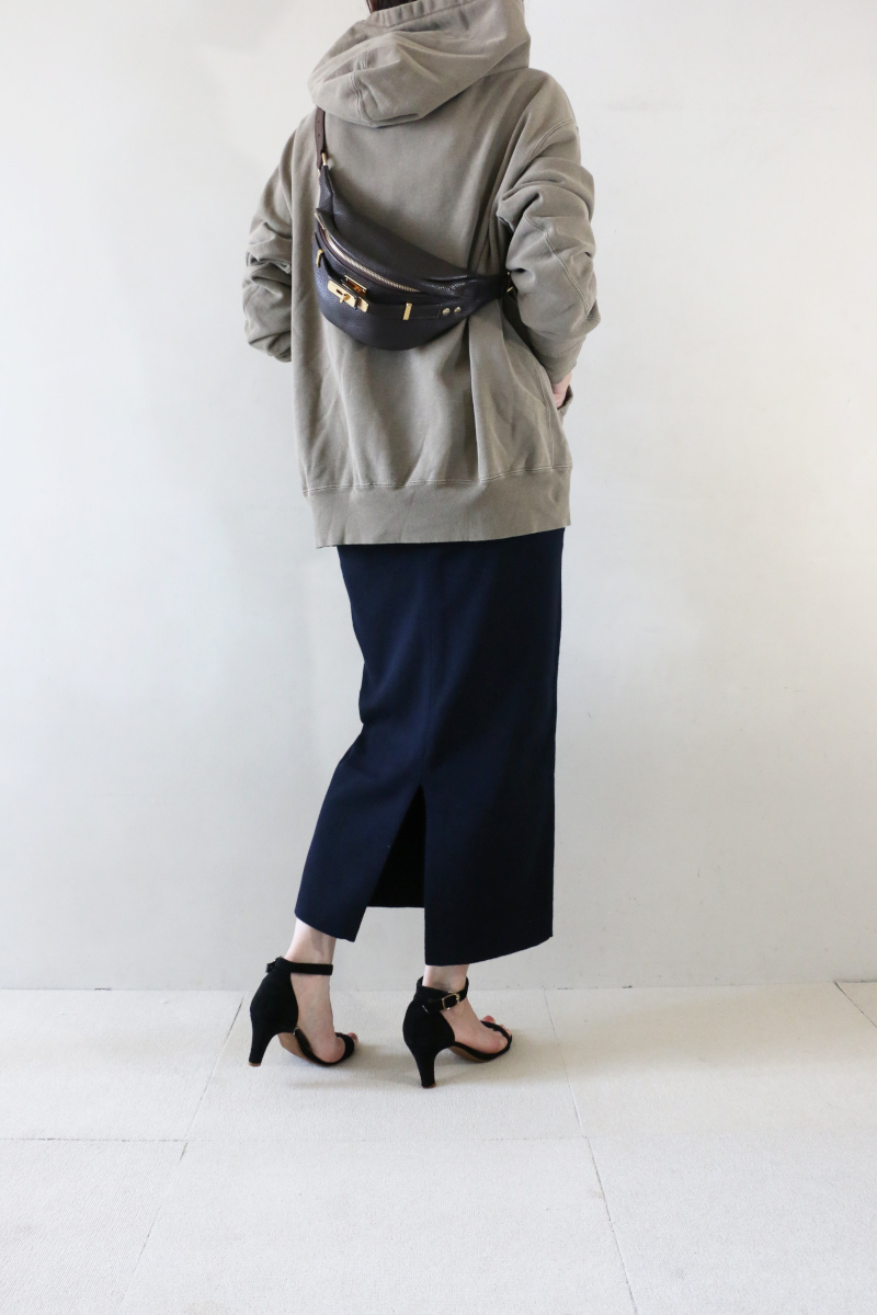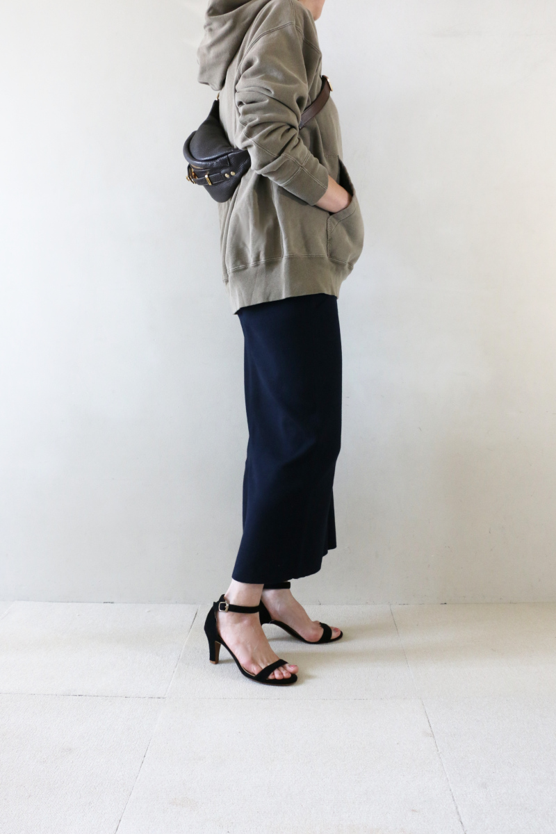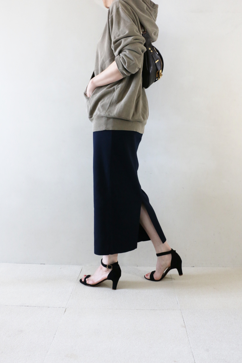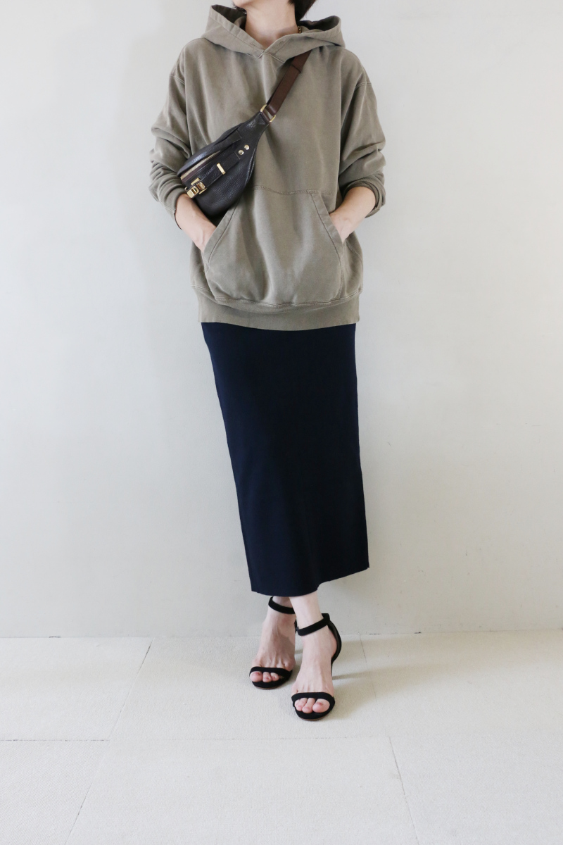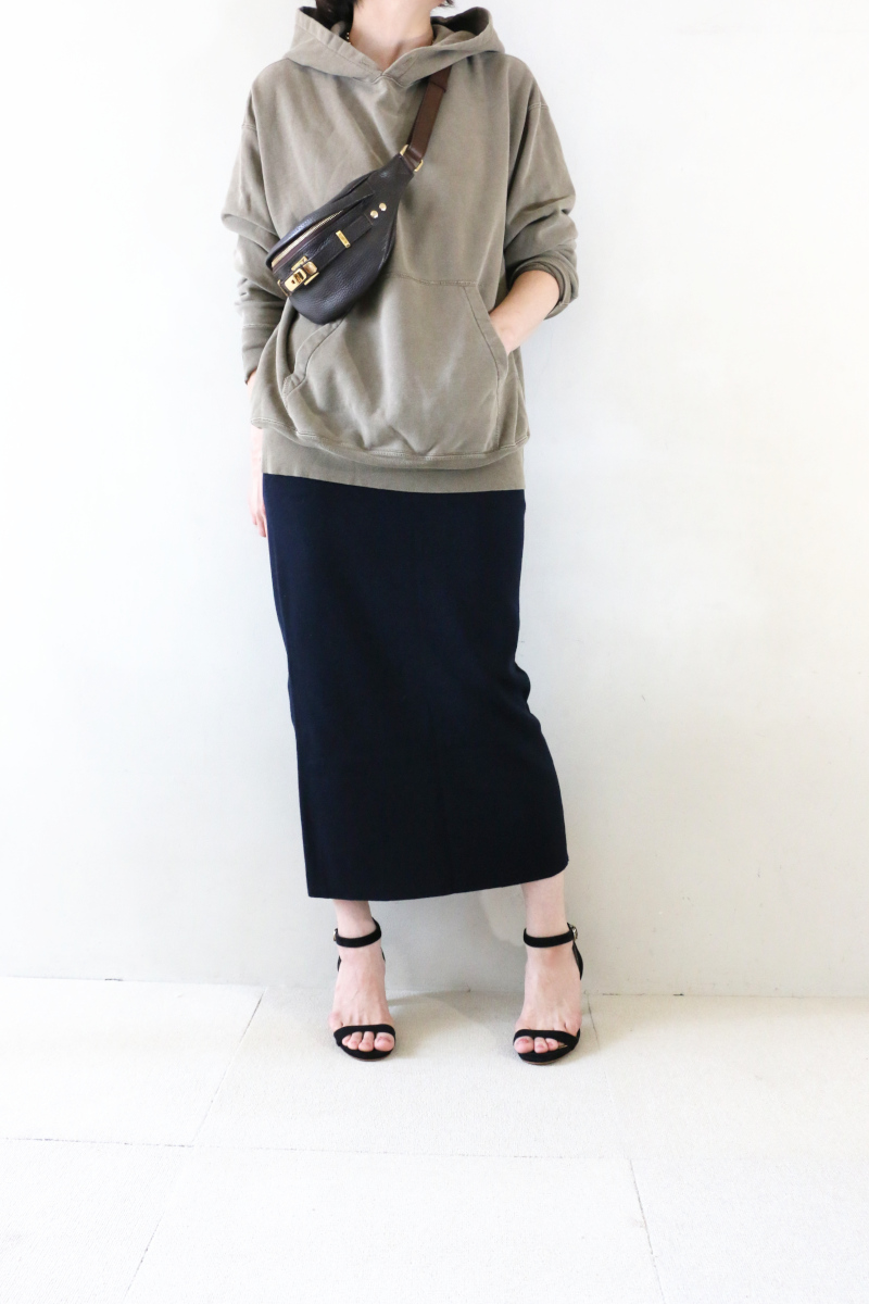そこに合わせたFRAMeWORKの総針編みのタイトスカート。しっかりとした編地が身体のラインを拾いすぎず、すっきりと縦のシルエットを演出してくれるのがポイント。パーカーの柔らかな抜け感と、タイトスカートのきちんと感。このコントラストが絶妙にマッチして、シンプルながらも洗練された“大人カジュアル”に仕上がります。