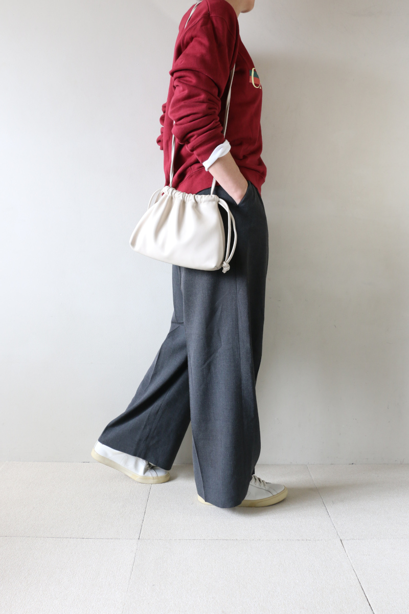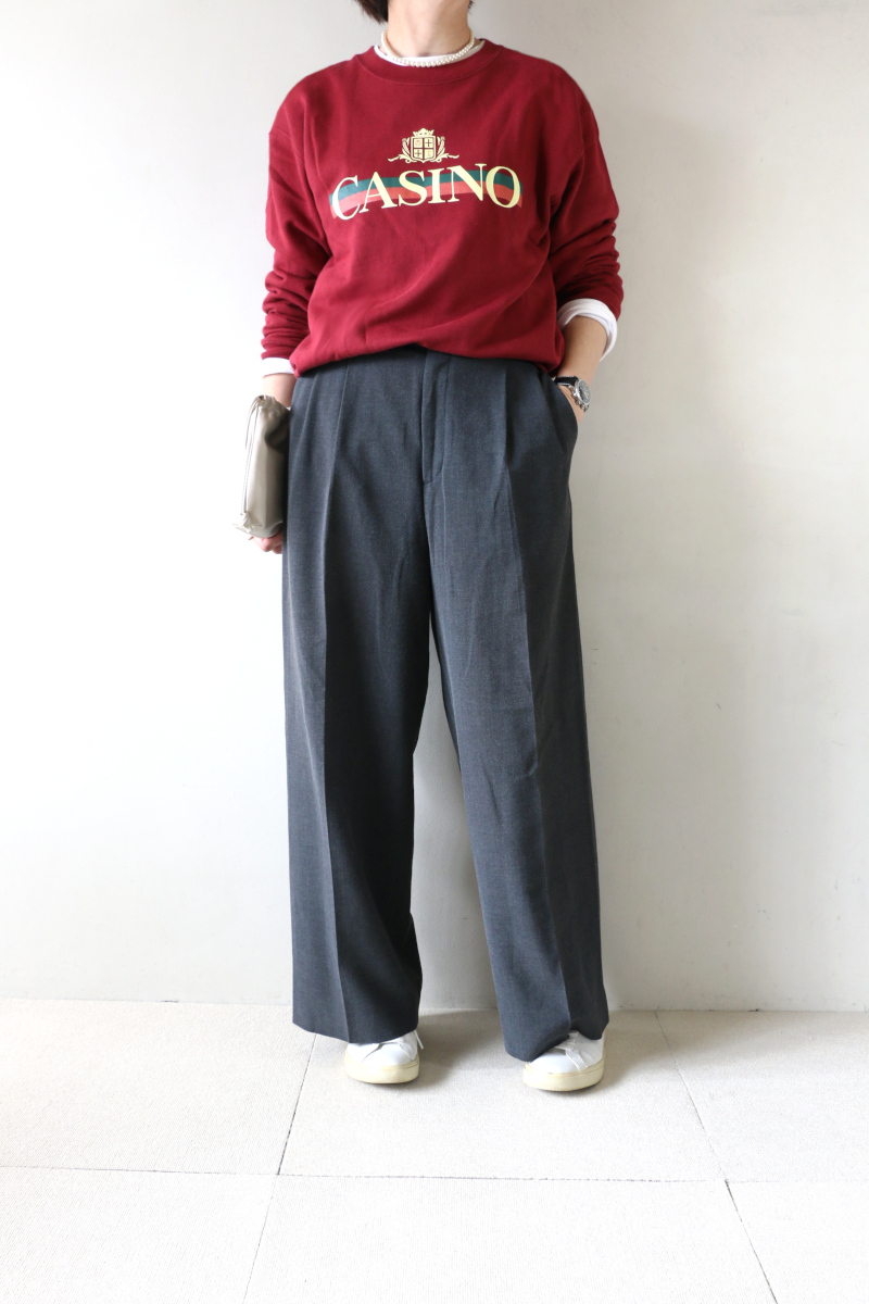 ゆるっとグレーのワイドパンツと合わせれば、シンプルながらもさりげない格上感をまとえます。あえて気取らず着こなす組み合わせ。肩の力を抜いた上質さが際立ち日常のワードローブがぐっとクラスアップ。ただのカジュアルで終わらせない、ワンランク上の大人スタイルです。
