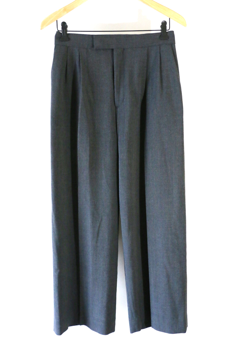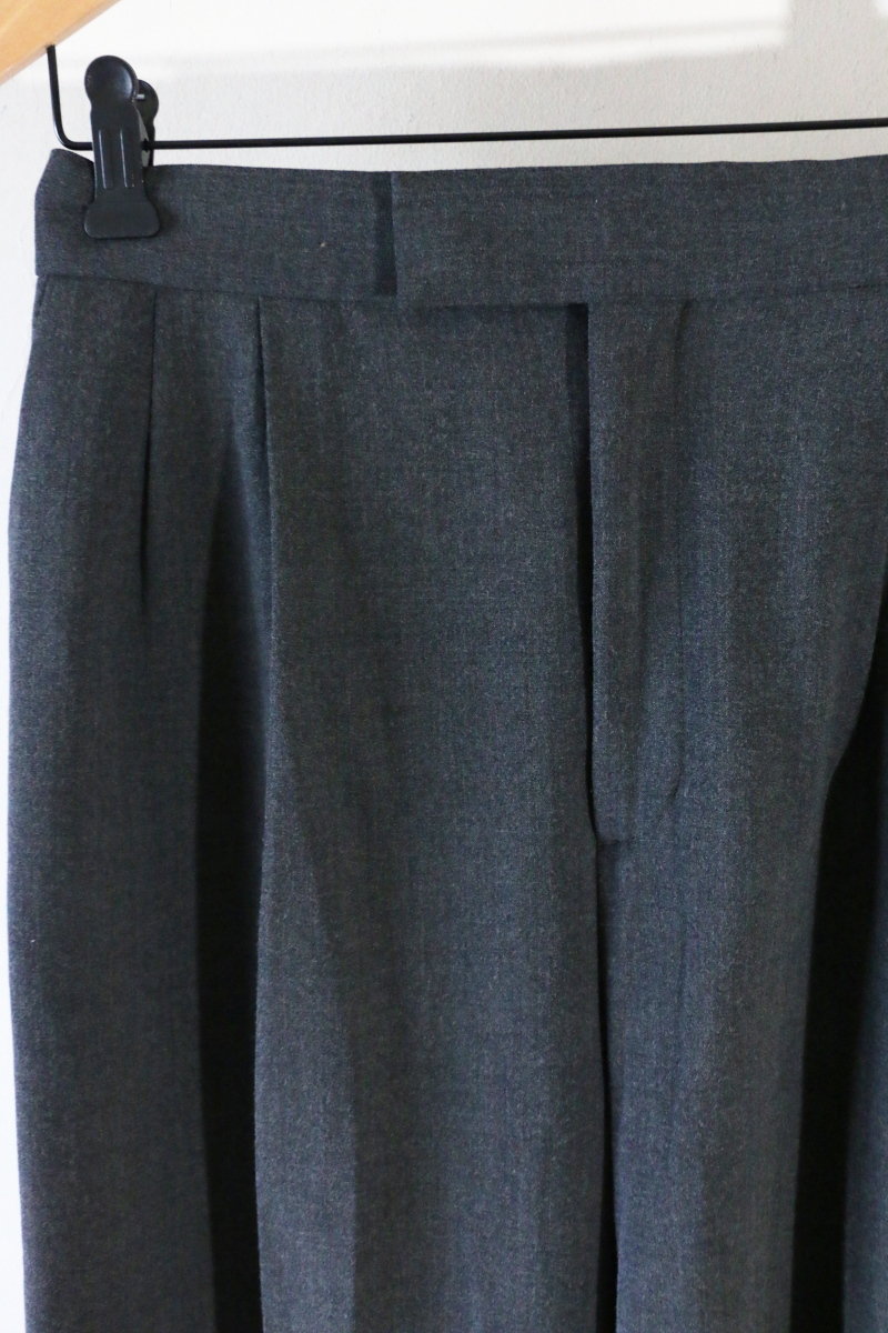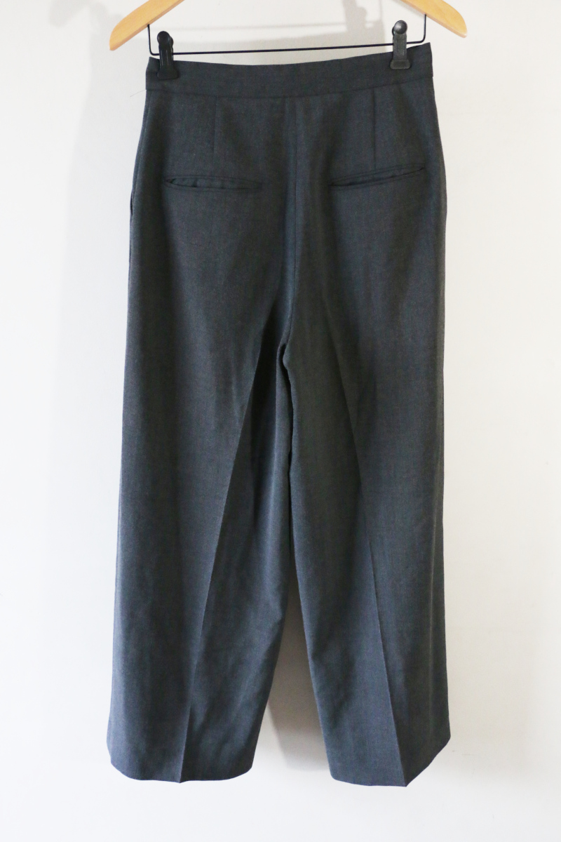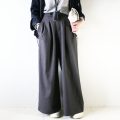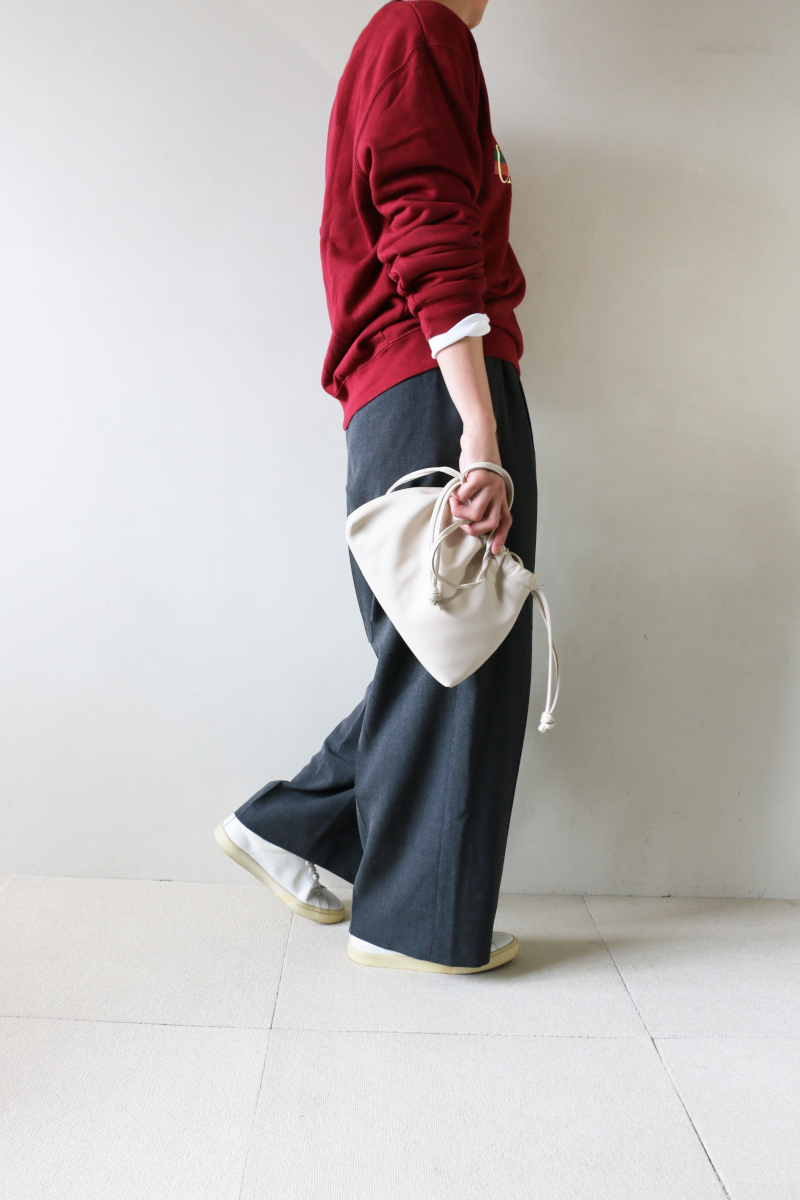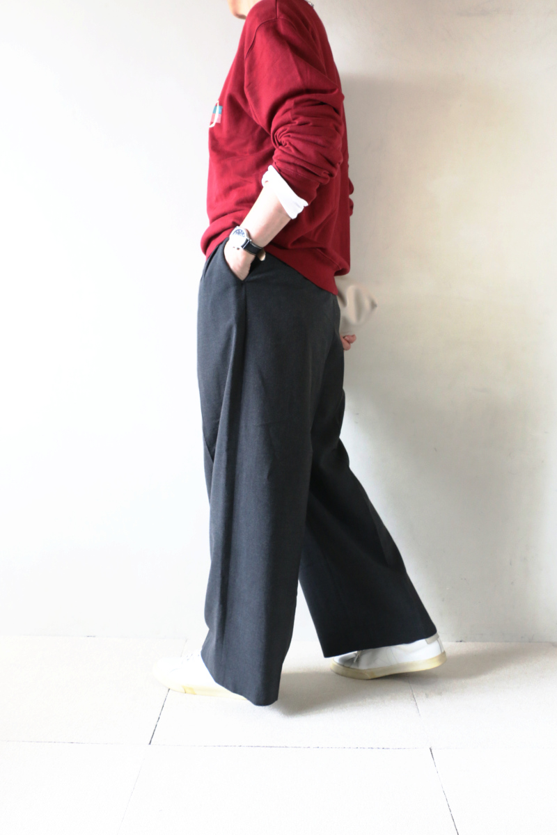 シーン問わず使える万能パンツ。ベストとセットアップで作っているパンツは、2タックでしっかりした太さが出るので、トップスはすっきりしたもので、マニッシュな雰囲気で着ていただくのがおすすめ。イタリアのヴィスコースの糸を使用した生地は、さらっとした風合いがよく、しわにもなりにくいです。