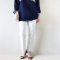 パンツはすっきりとしたプレスが美脚ラインを強調し、オフホワイトのニュアンスカラーがスタイリング全体をワントーンでまとめて洗練された雰囲気に。ベージュとホワイトの淡い色合いは肌映りを明るく見せ、顔周りも華やかに。抜け感と上品さを兼ね備えたコーディネートは、通勤から休日まで幅広く対応でき、シーズンをまたいで大人のワードローブに欠かせない組み合わせです。