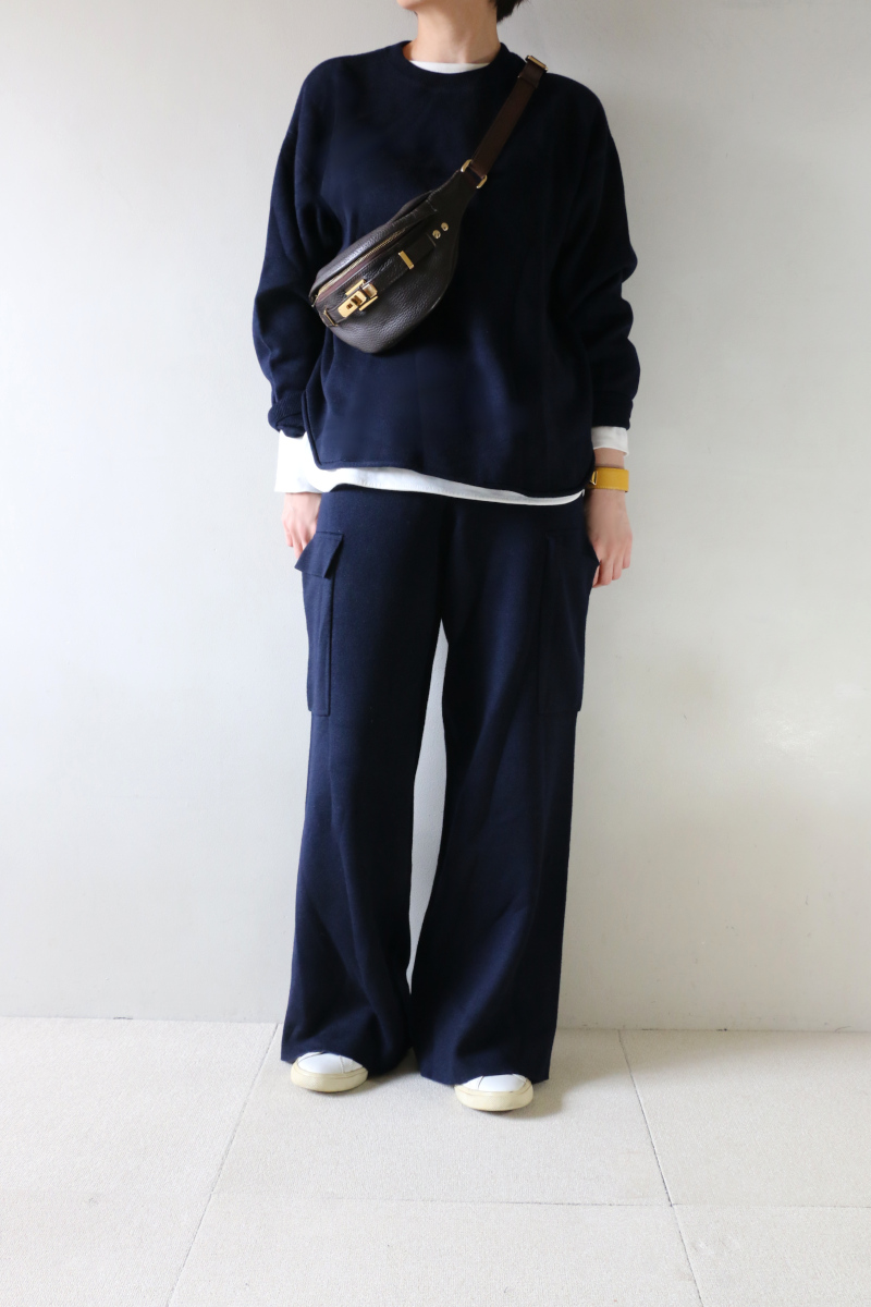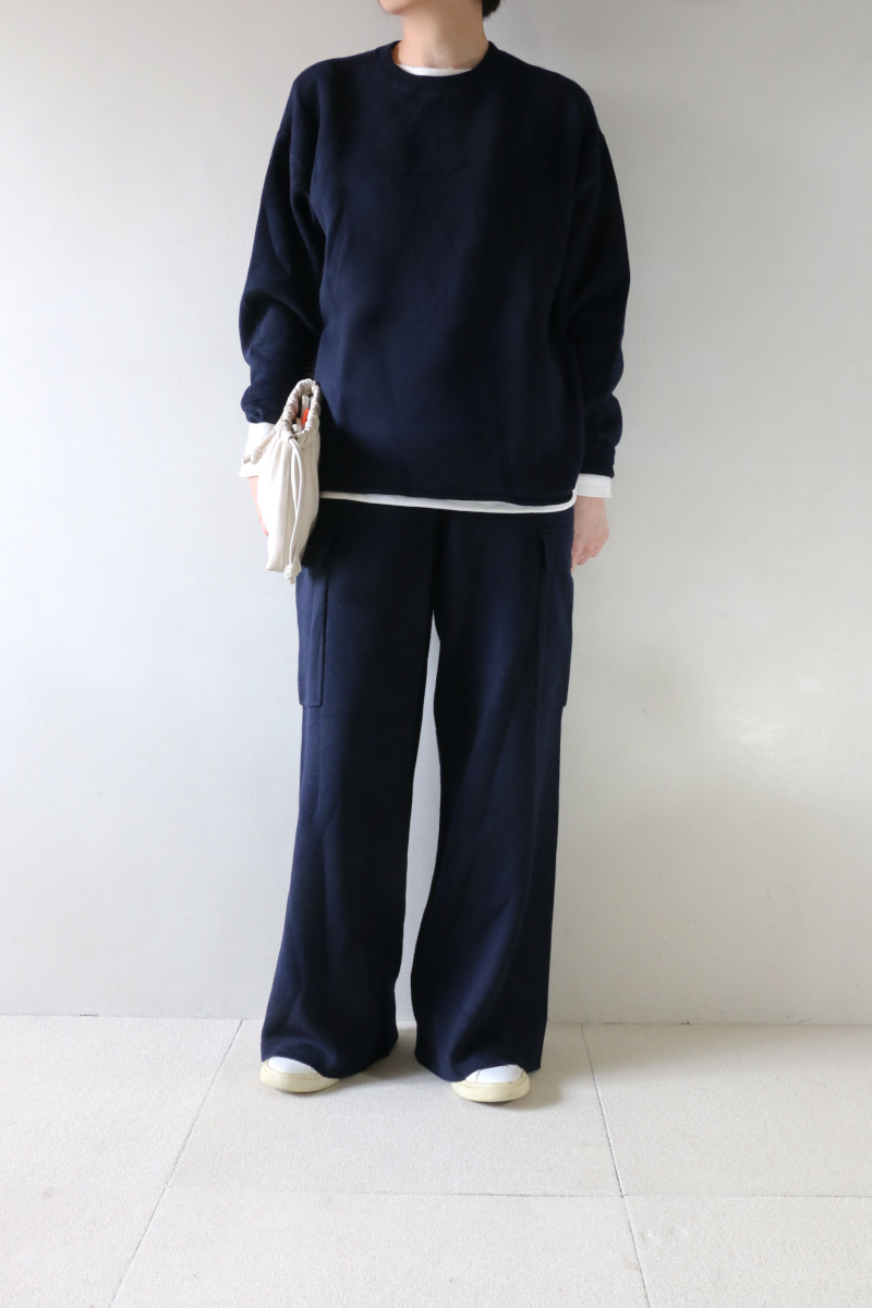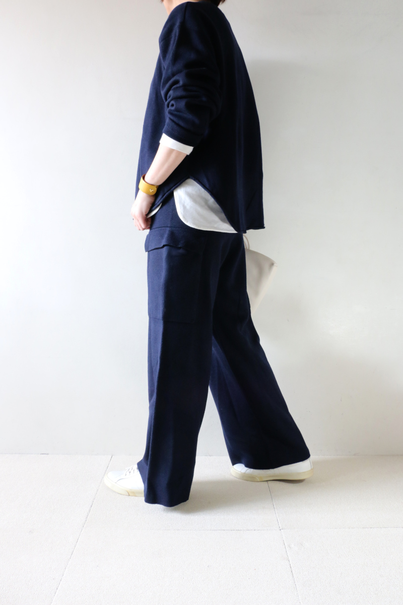 ウール混素材でふわっと柔らかくスウェットのような感覚で着て頂けるニットパンツ。ややワイドゆったり目なサイジングのパンツはサイドポケット付きで新鮮なスタイリングが完成します。