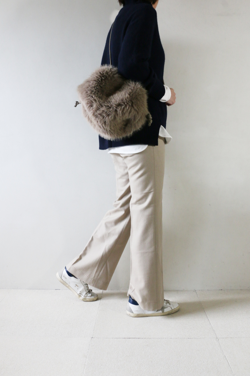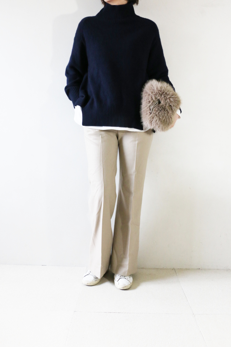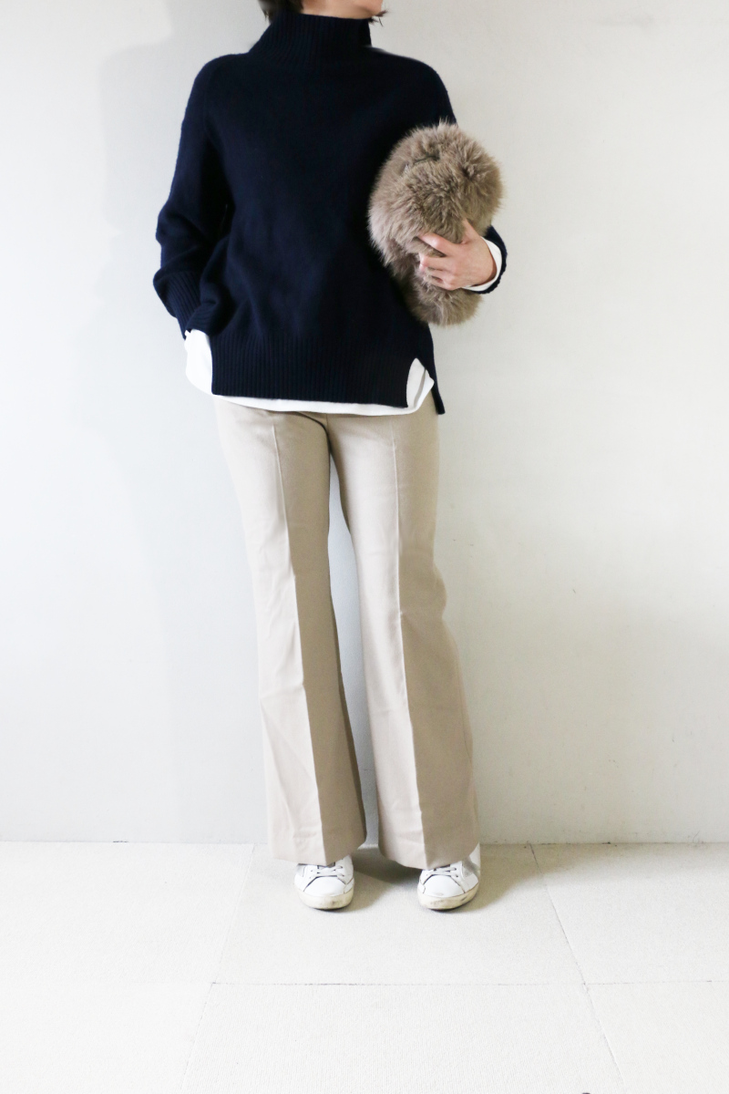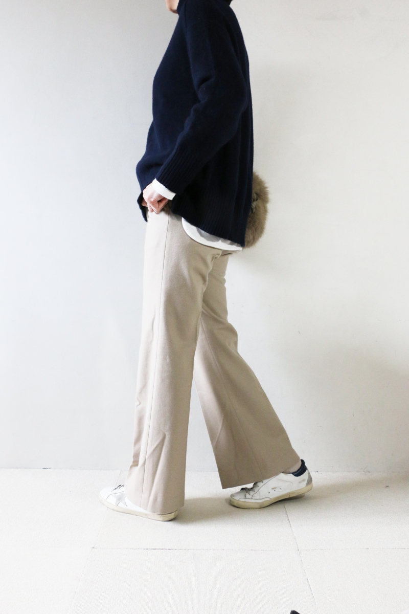 合わせたAPSTUDIOのパンツは、上質なフランネル素材で滑らかな肌触りと暖かさを実現。ベージュカラーが柔らかく、ネイビーのタートルネックとのコントラストが上品で、カジュアルにもきれいめにも着こなせます。シンプルながらも素材感と色のバランスで冬の装いを格上げする、大人のデイリースタイルにぴったりです。