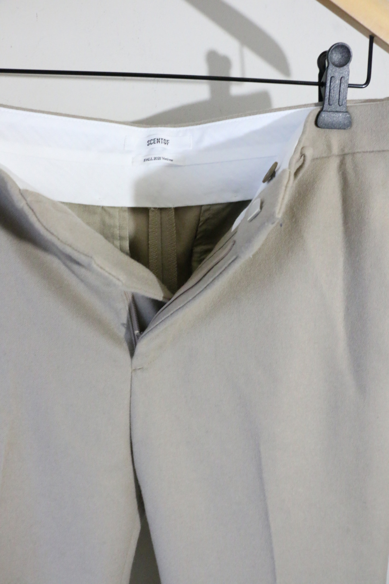 モダンに履けるSCENTOFのフランネルパンツ。デザイナーが今シーズン気になったフランネル生地。その世界では最も有名な“FOX BROTHERS”社の生地を使用し、ニットやコートを合わせても野暮ったく見えず、モダンに着こなせる1本に仕上げました。“FOX FLANNNEL”のしなやかで滑らかな生地感は唯一無二の風合いです。裾にかけて程よいフレアシルエットになっており美脚効果も◎ジャストサイズで少しコンサバな印象で履いても、腰で合わせて少しルーズに履いても素敵です。