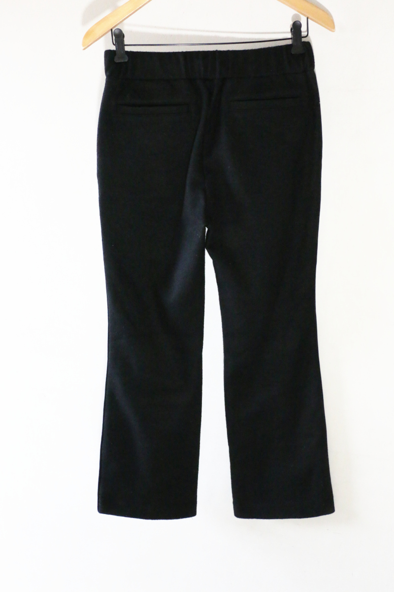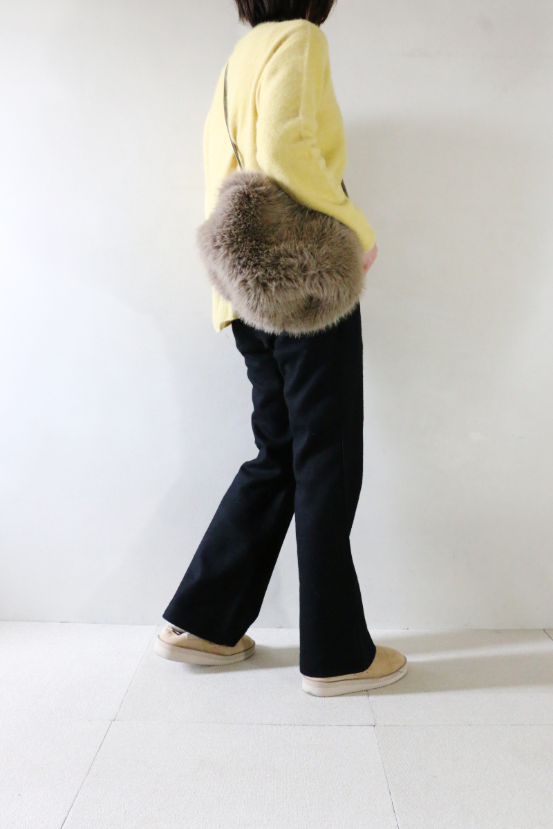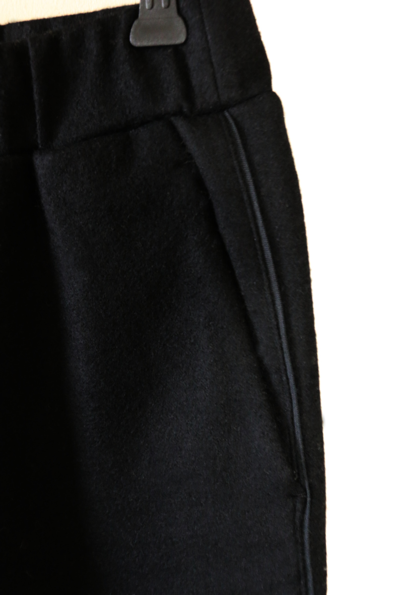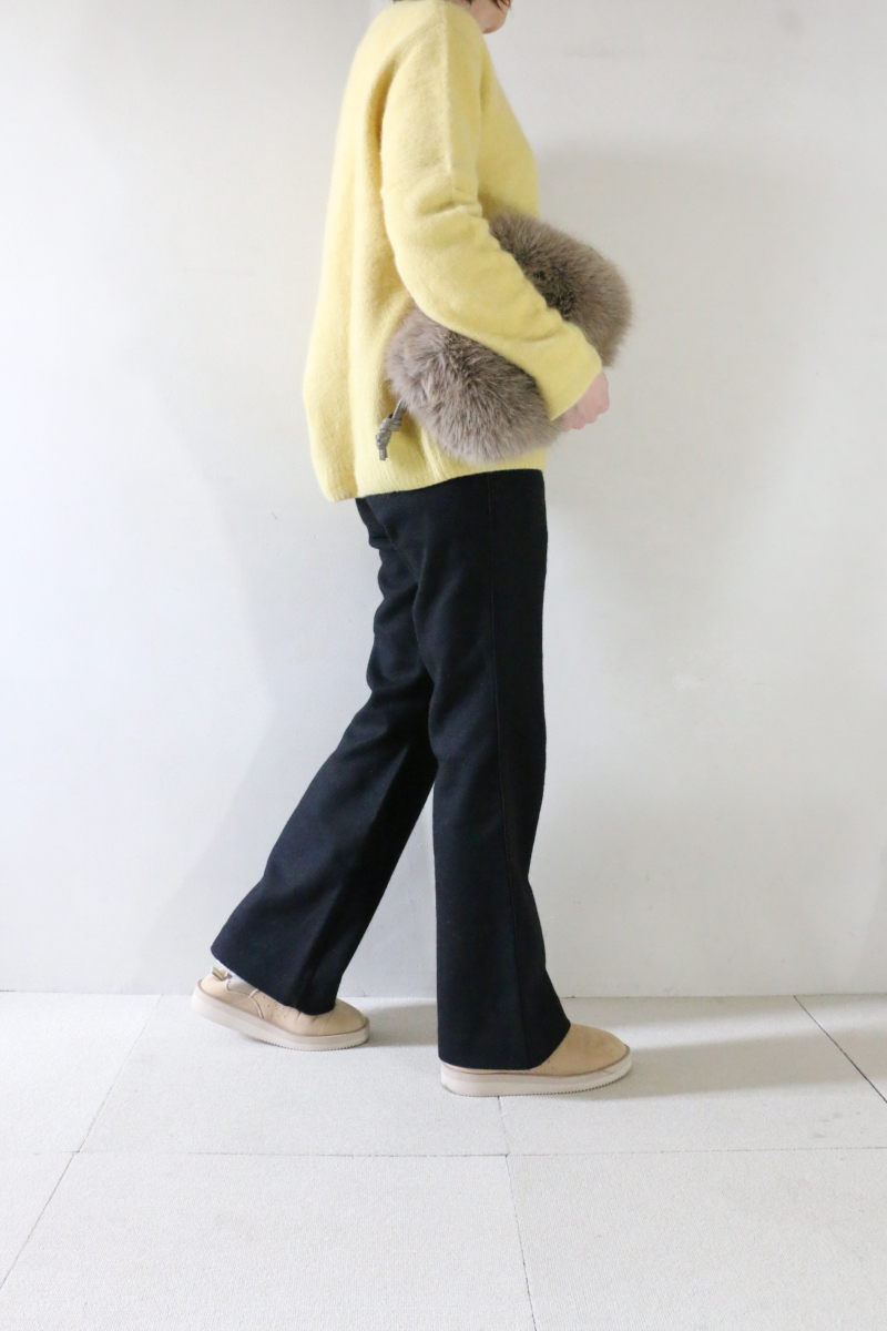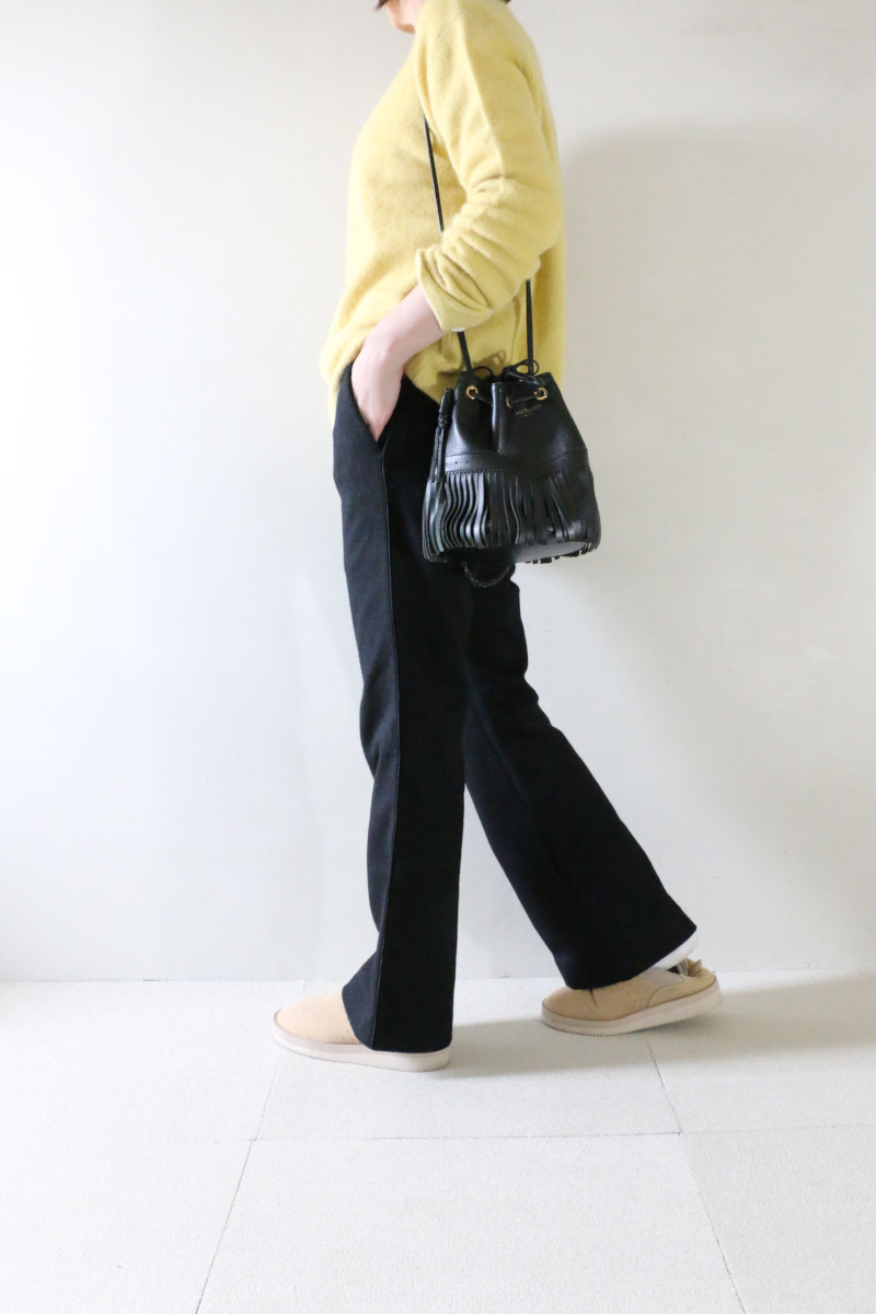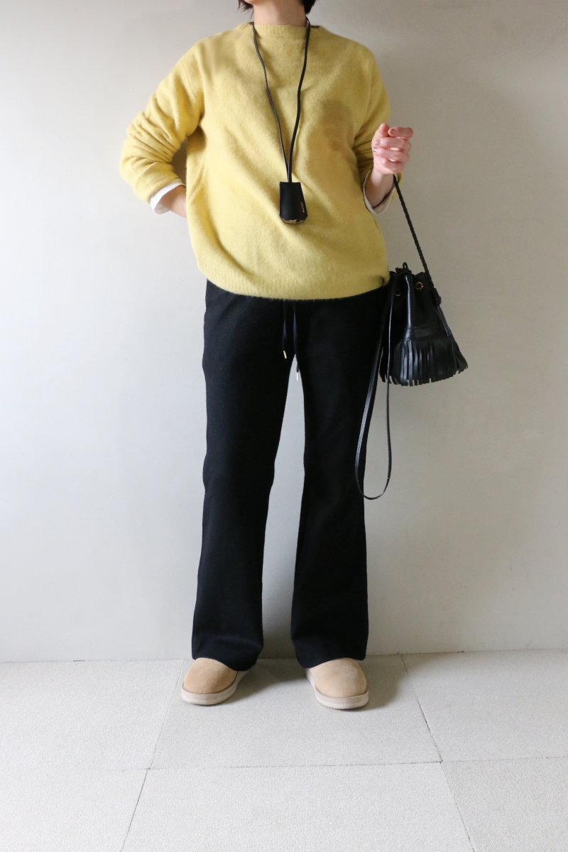 合わせたのは、museドゥーズィエムクラスのウールジャージパンツ。とにかく“あたたかい”のに、イージーなドロストウエストでノンストレス、なのにきれい見えするのが魅力。黒のパンツがエッグカラーの優しい発色をより引き立て、甘さと大人っぽさのバランスを作ります。