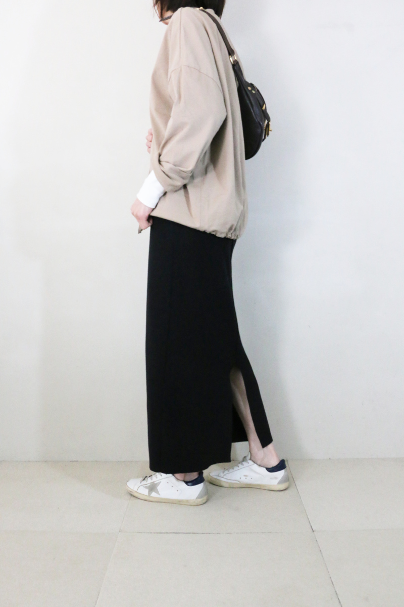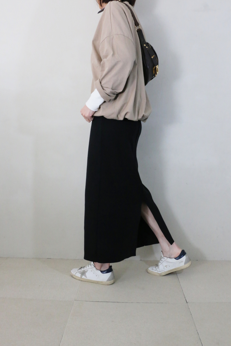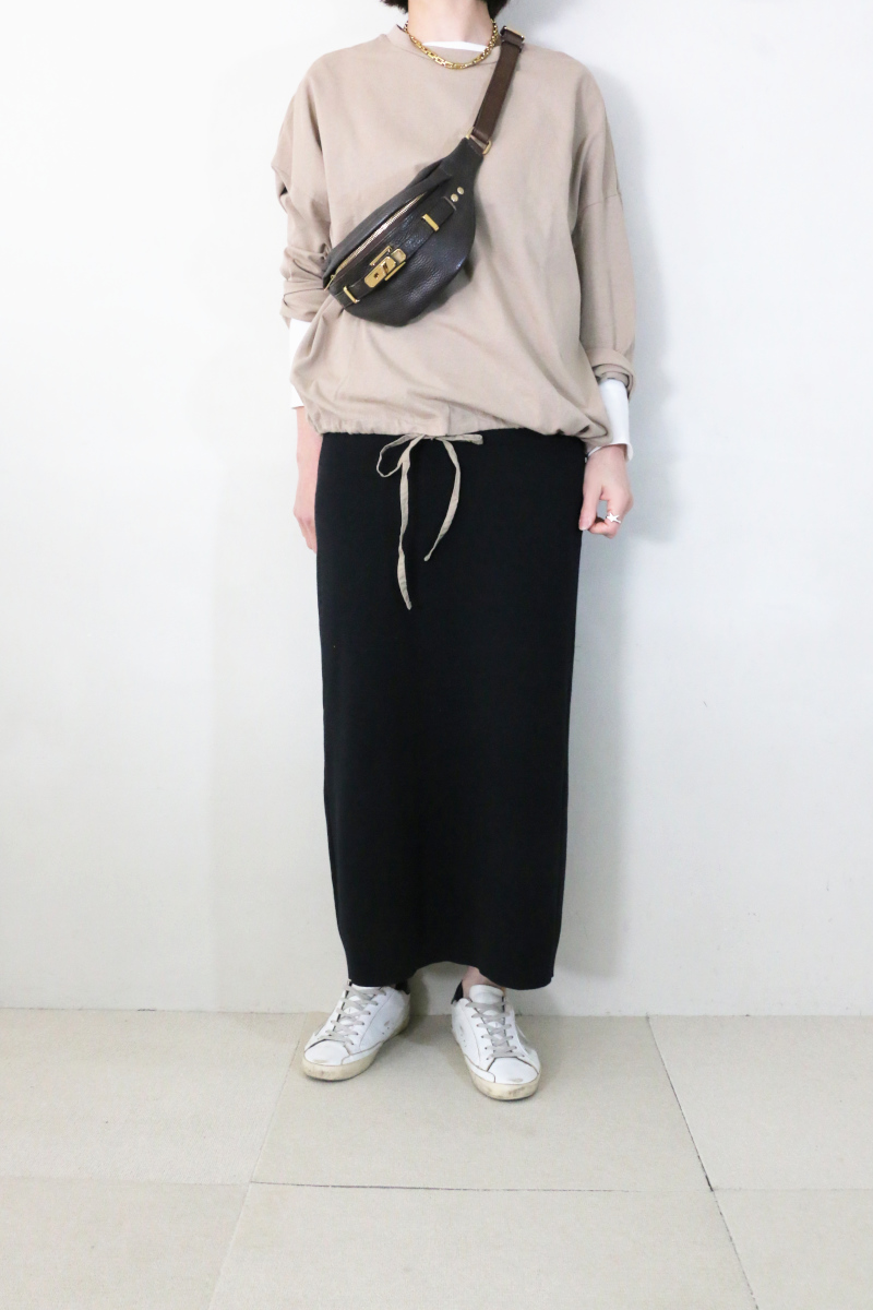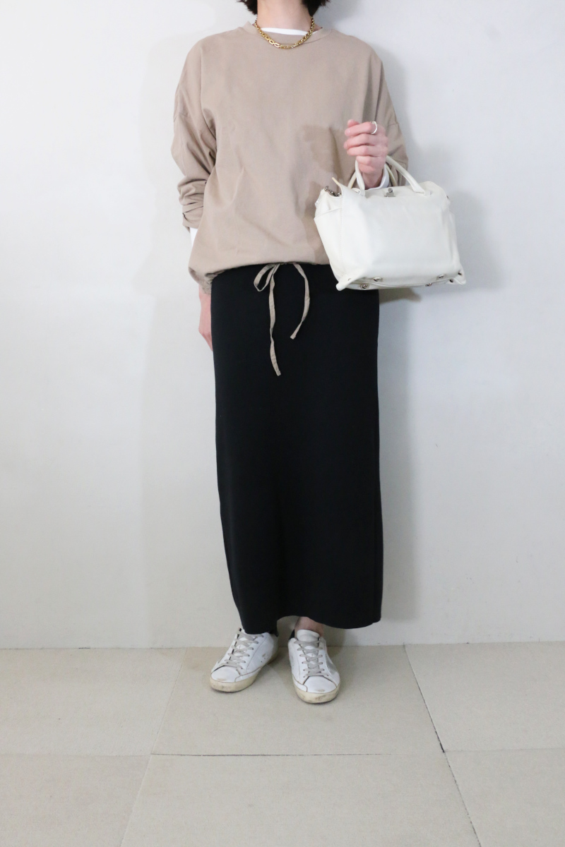 合わせたのは、同じくrelumeのウォッシャブル総針タイトスカート。ブラックの引き締まった表情とすっきりとした縦ラインが全体を整え、上品さを添えます。適度な緊張感が生まれることで、トップスの柔らかさとの対比も自然に引き立ちます。