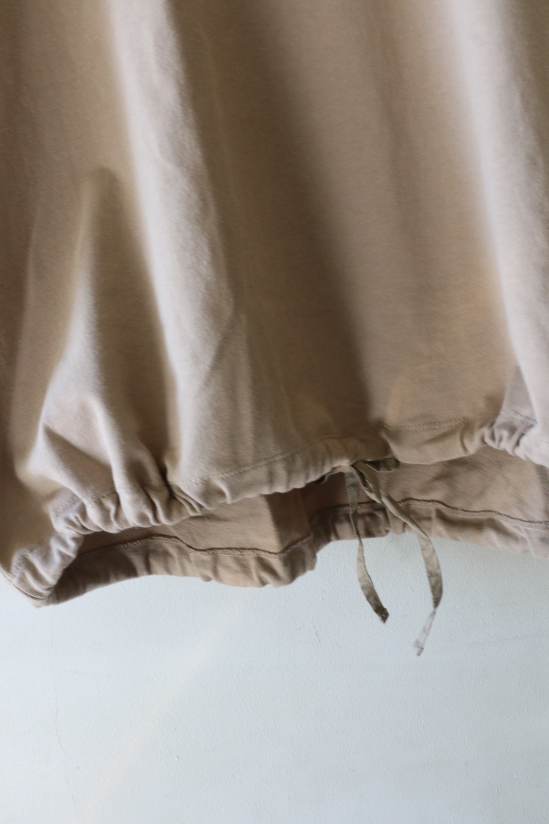 ややしっかりとした生地感で透けにくい素材のTシャツ。裾のドロストコードを絞れば、ブラウジングでこなれた雰囲気に。シルエットの変化を楽しめるので、着こなしの幅が広がります。