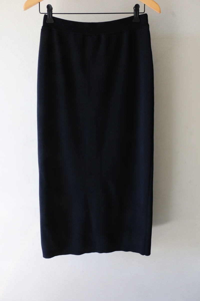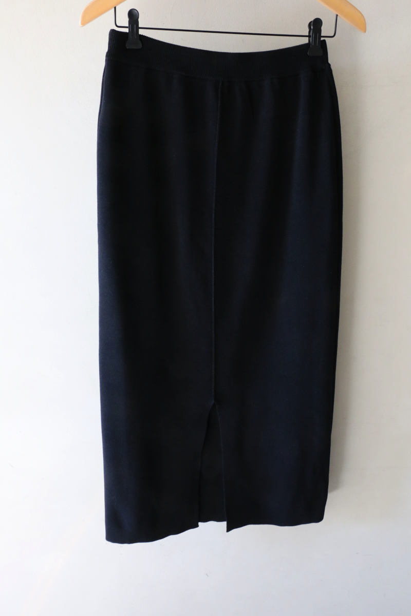 ドライタッチな風合いの綺麗めなニットスカート。スッキリと穿きやすく、着回しの効く一枚です。同シリーズのジレとセットアップでの着用もお勧めです。ヒールや綺麗めなカバンと合わせればオンスタイルにも◎ご自宅でケア出来るのも嬉しいポイントです。