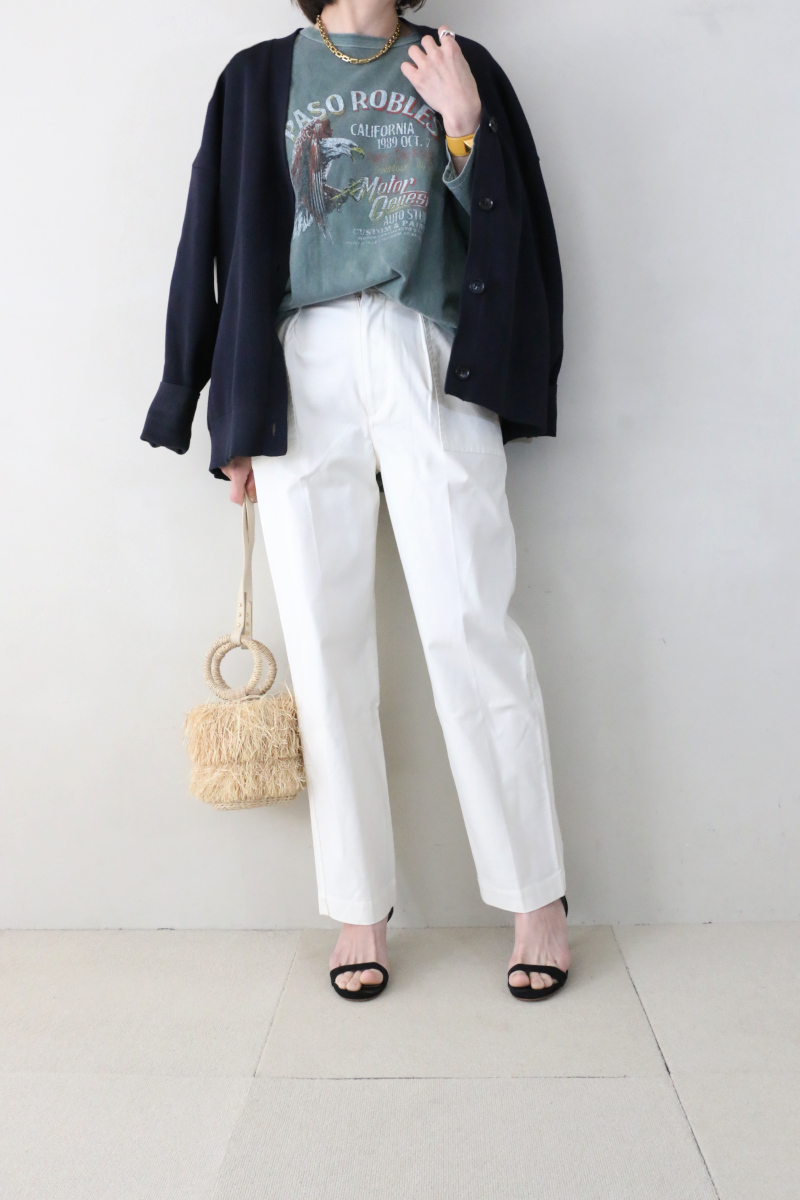 トップはAP STUDIOのワイドニットカーディガンに、GOOD ROCK SPEEDのヴィンテージ感漂うカットソーをレイヤード。カーディガンは、後ろ姿まで絵になる立体的なシルエットと、ハイゲージ特有のしなやかな質感が魅力です。ゆったりとした身幅に対して袖口を軽く捲ることで、手首に程よい抜け感が生まれ、女性らしいバランスを作ります。