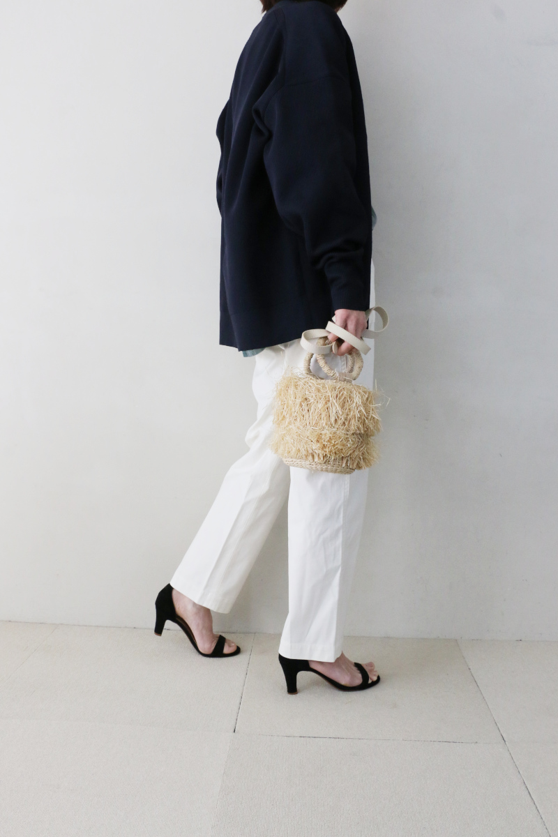 今回は仕上げに、春夏らしいカゴバッグや華奢なサンダルを添えて、季節感をプラス。ネイビーとホワイトのコントラストを活かしながら、異素材を重ねることで単調にならない着こなしもお勧めです。自分らしいニュアンスを大切にする、こなれ感のある大人の組み合わせを。